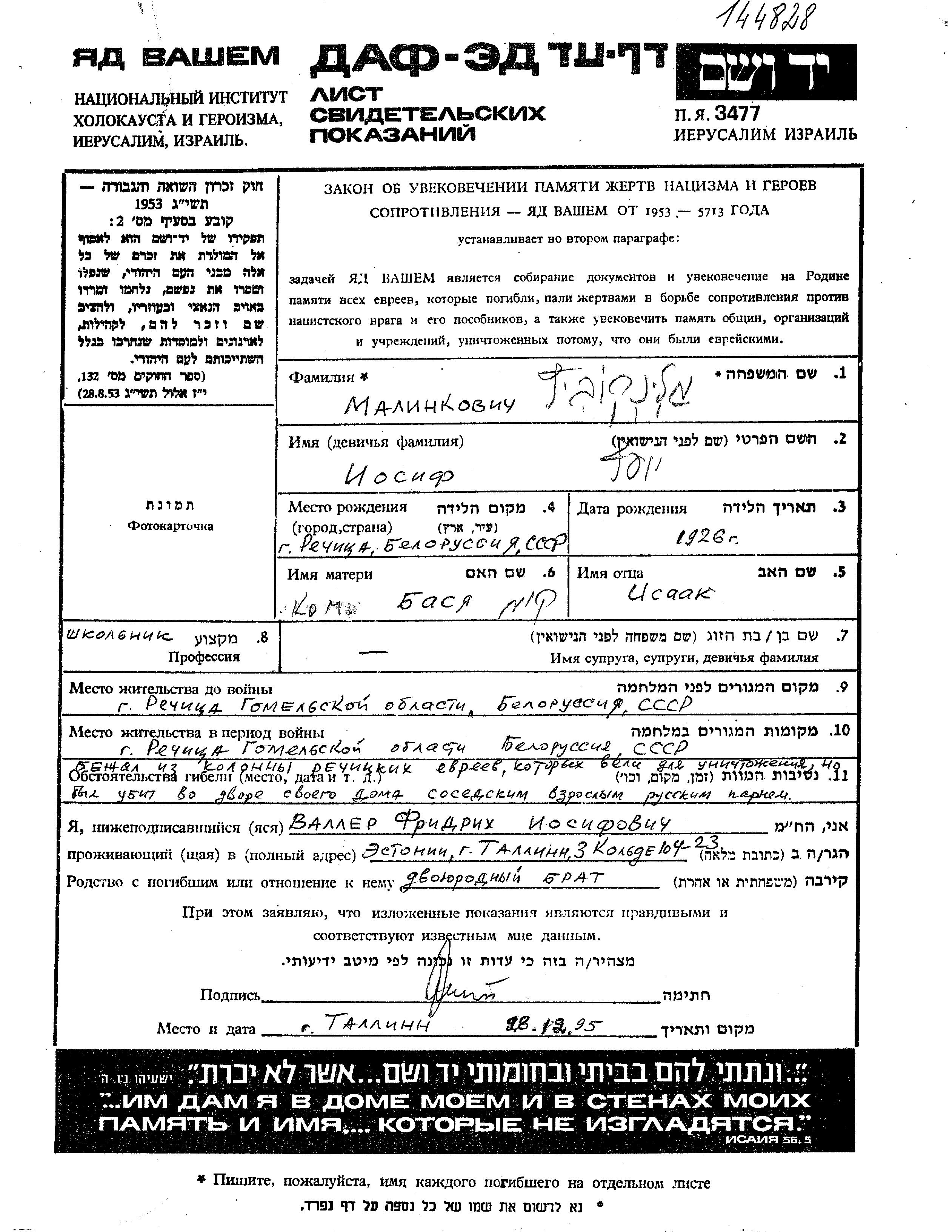 Malinkovich Iosif 1926 Rechitsa, Belorussia (USSR) Page of Testimony