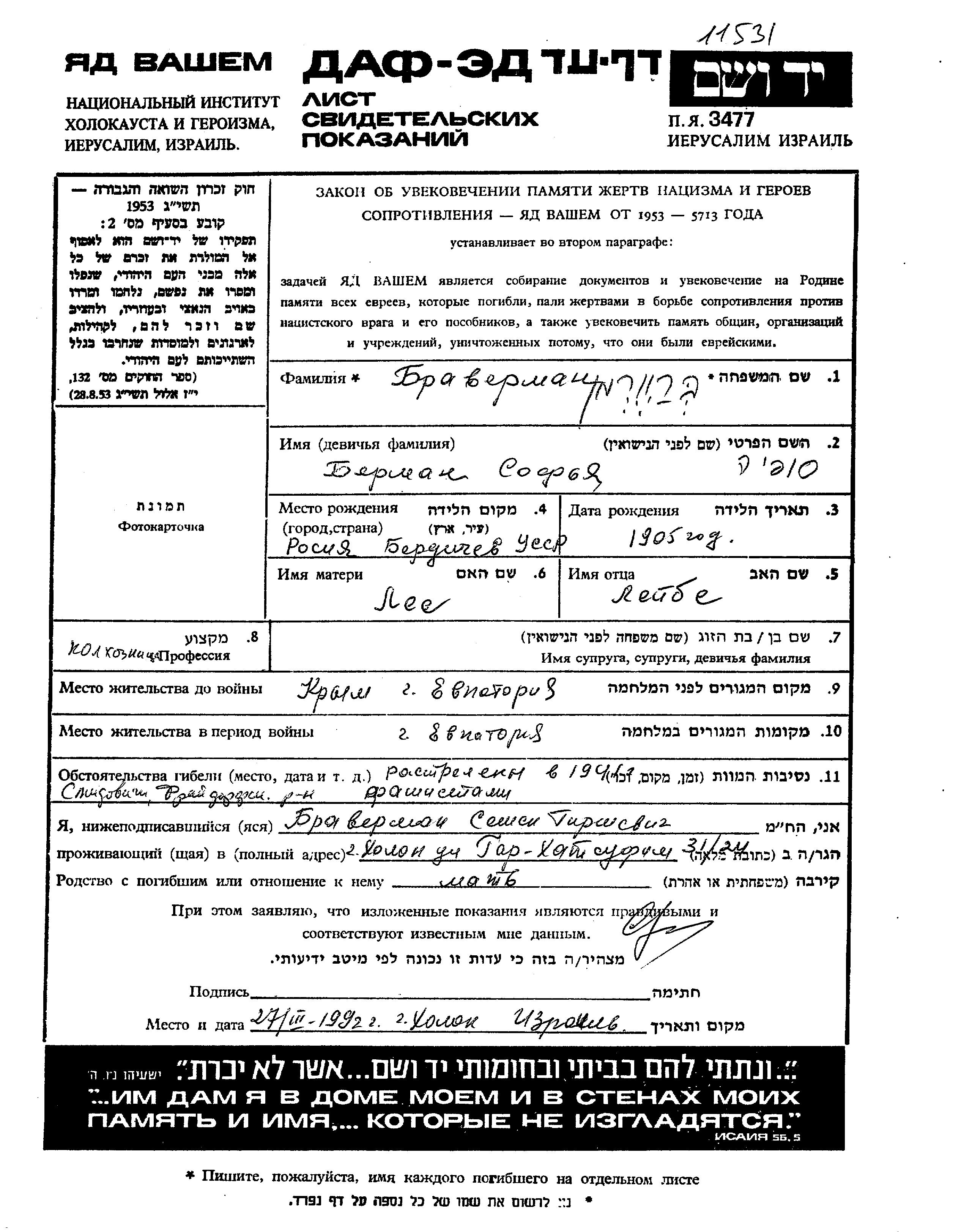 Braverman Sofia 1905 Yevpatoriya, Russia (USSR) Page of Testimony