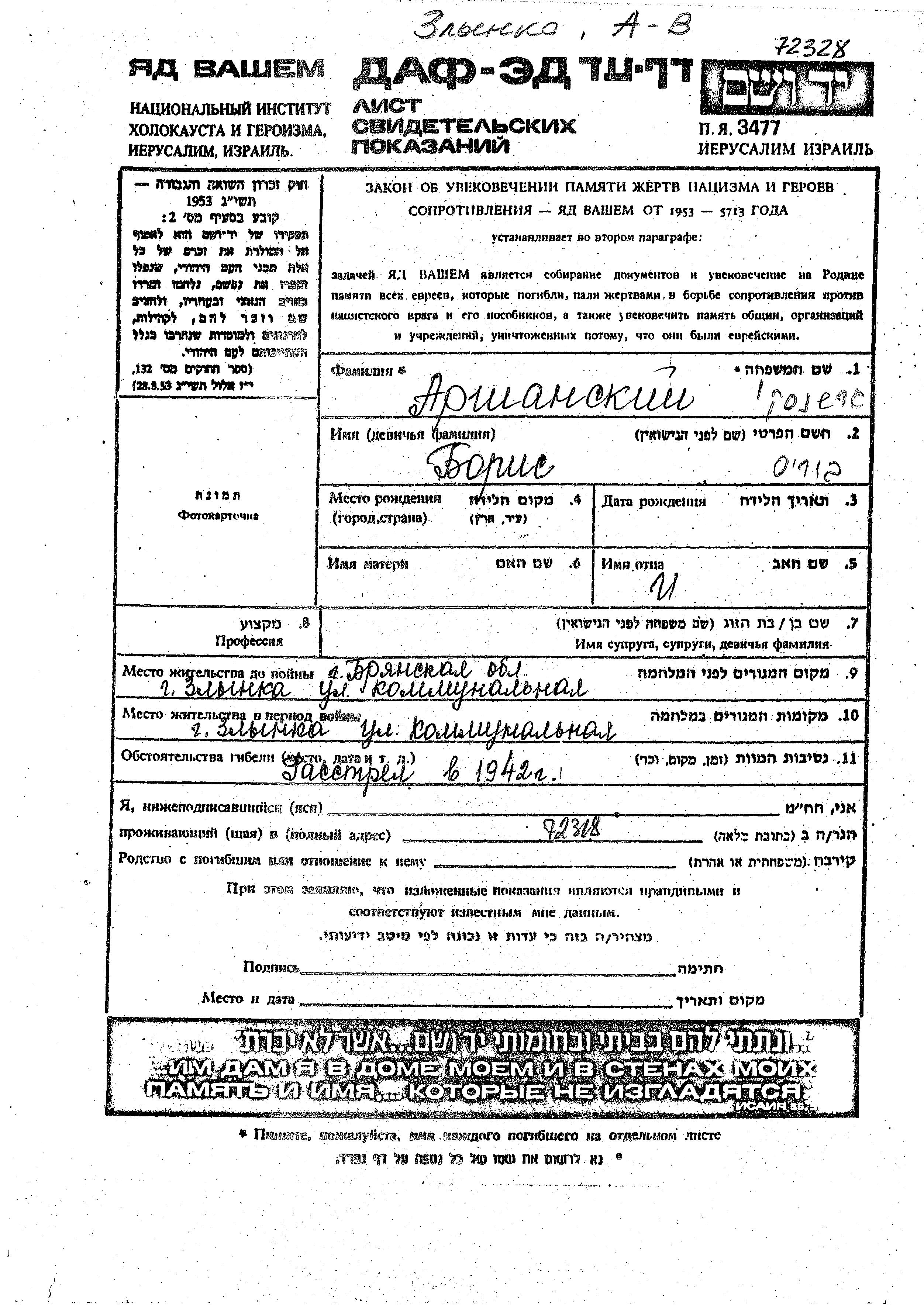 Arshanski Boris Zlynka, Russia (USSR) Page of Testimony