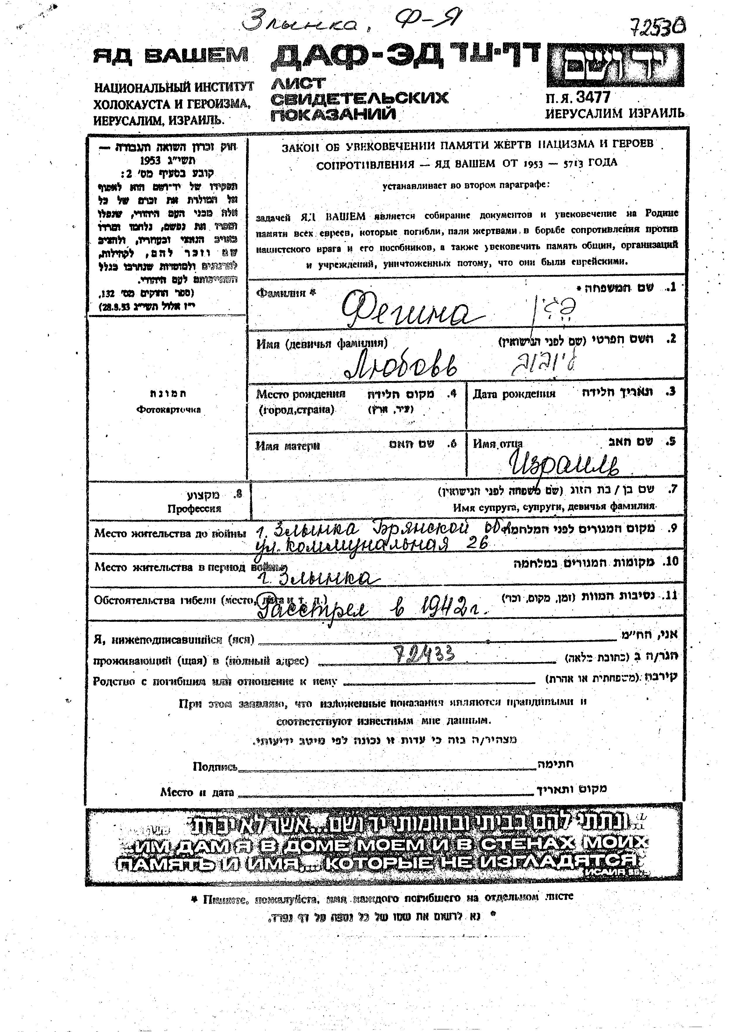 Fegin Lyubov Zlynka, Russia (USSR) Page of Testimony