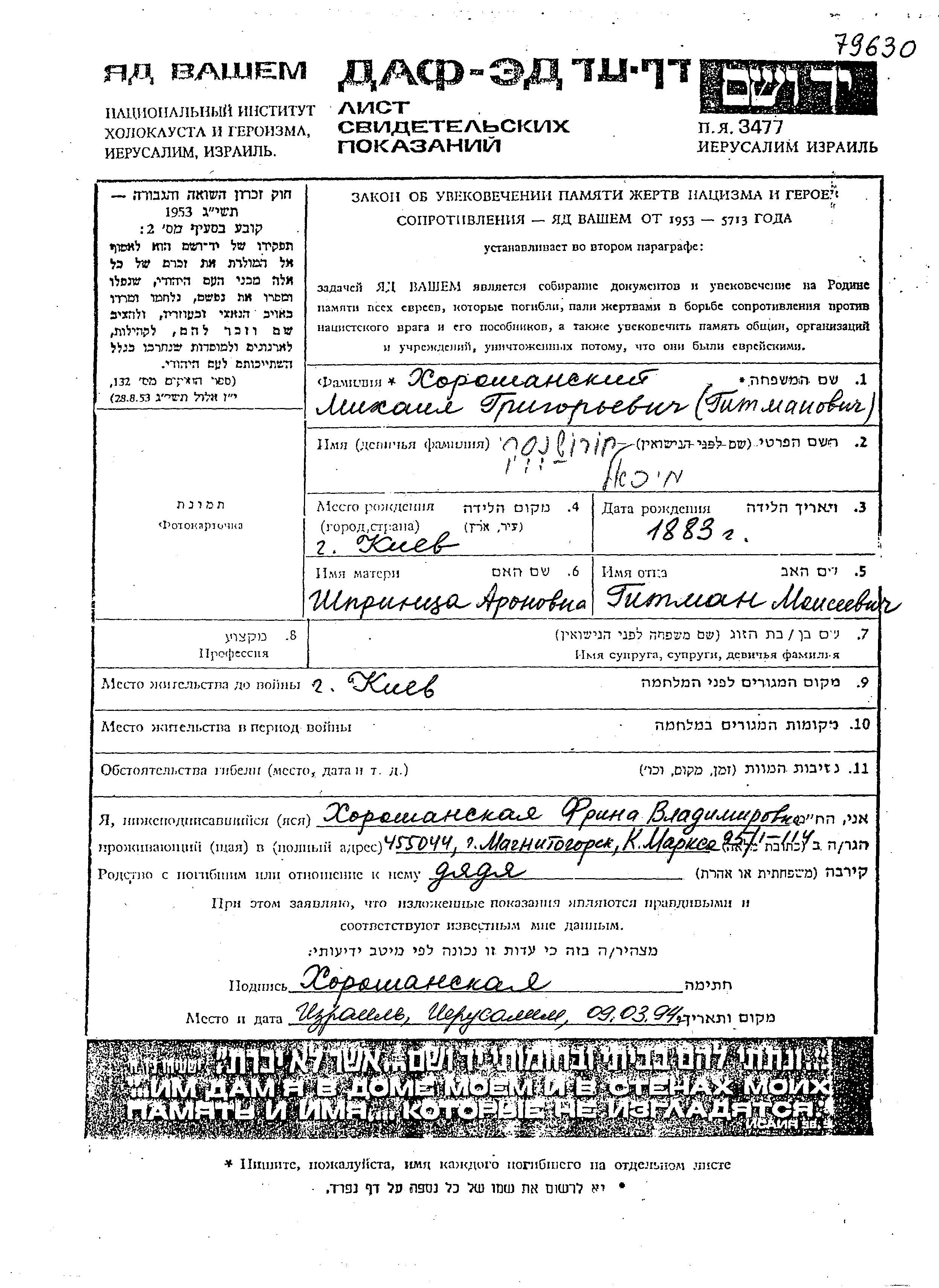 Khoroshanski Mikhail 1883 Kiyev, Ukraine (USSR) Page of Testimony