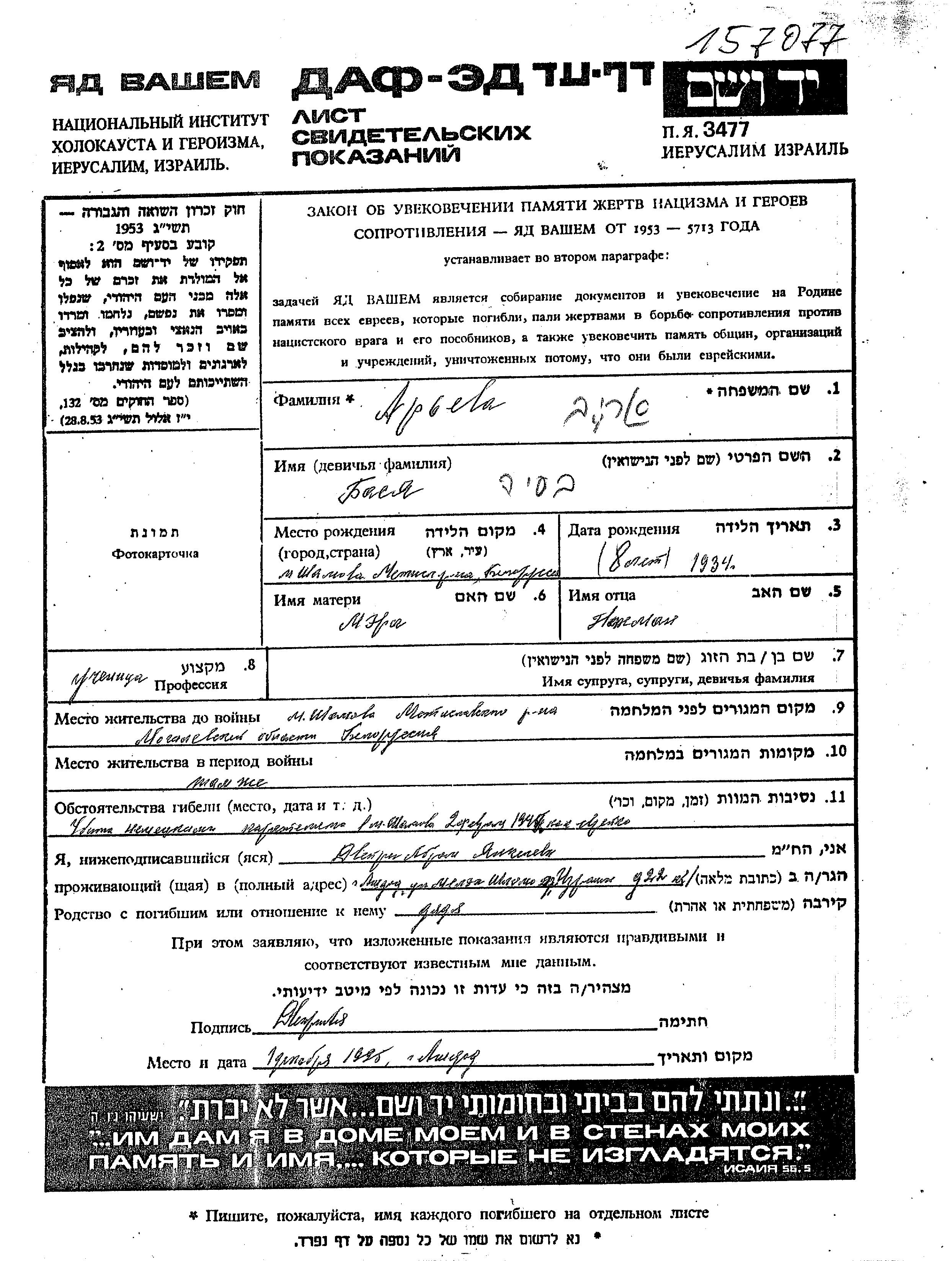 Basia Aryev was born in Shamovo, Belorussia (USSR), 1934 to Nakhman and Mera nee Dveirin. She was child. Prior to WWII she lived in Shamovo, Belorussia (USSR). During the war she was in Shamovo, Belorussia (USSR). Basia was murdered in the Shoah. Place of death: Shamovo, Belorussia (USSR), 02/02/1942.