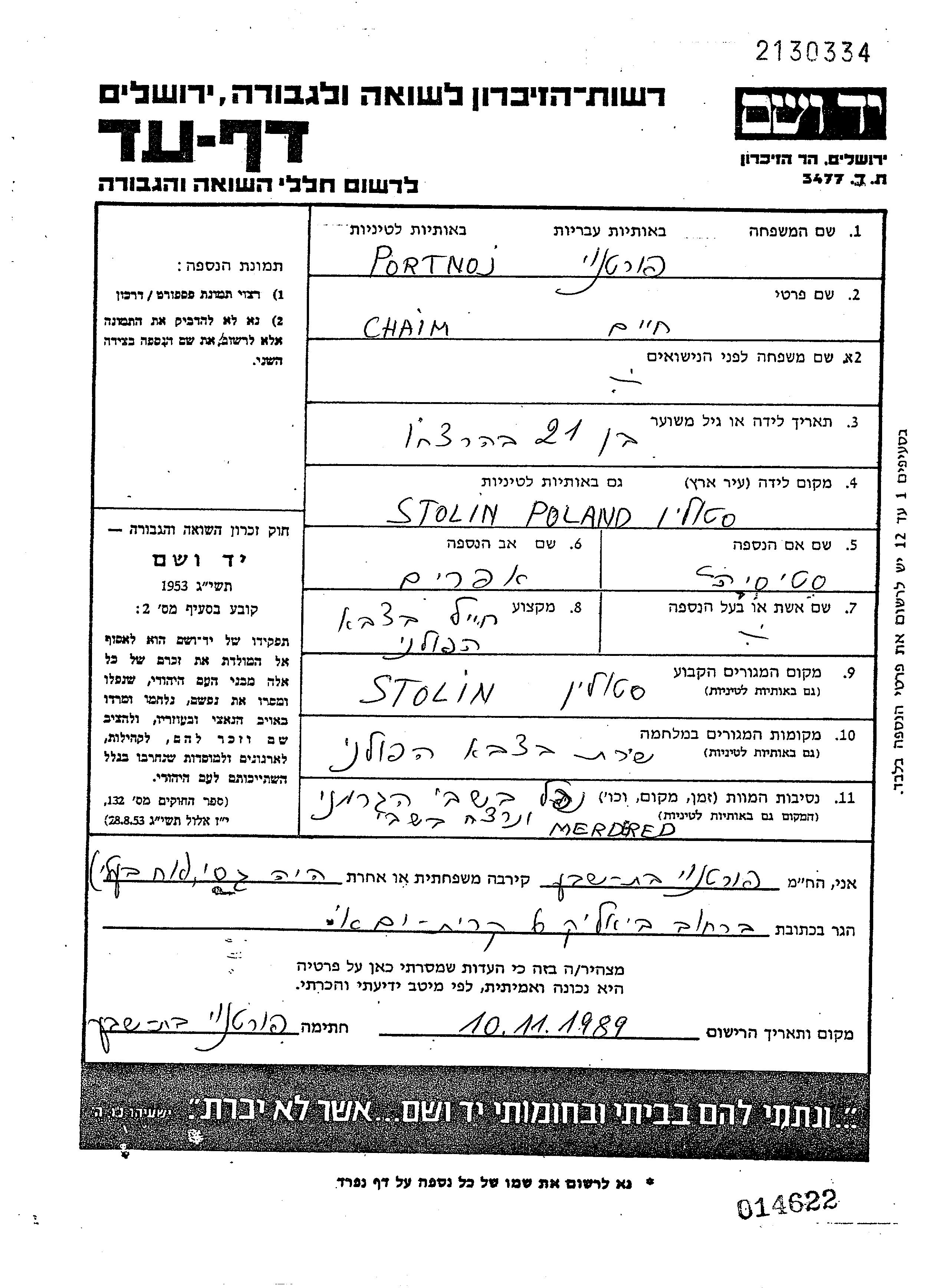 Portnoj Chaim Stolin, Poland Page of Testimony
