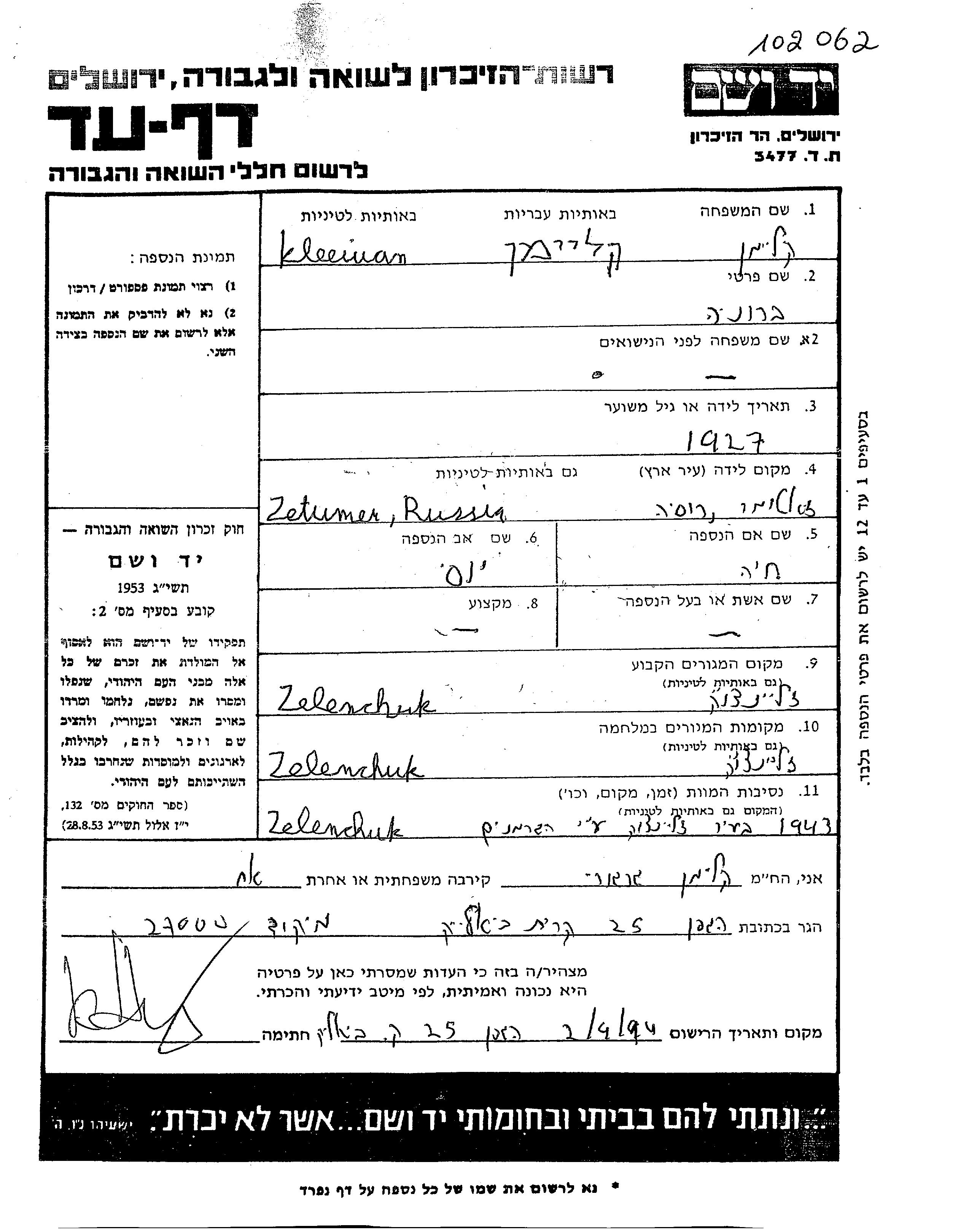 Bronia Kleiman was born in Zhitomir, Ukraine (USSR), 1927 to Josi and Chaya nee Aizenberg. She was child. Prior to WWII she lived in Zelenchukskaya, Russia (USSR). During the war she was in Zelenchukskaya, Russia (USSR). Bronia was murdered in the Shoah. Place of death: Zelenchukskaya, Russia (USSR), 1943.