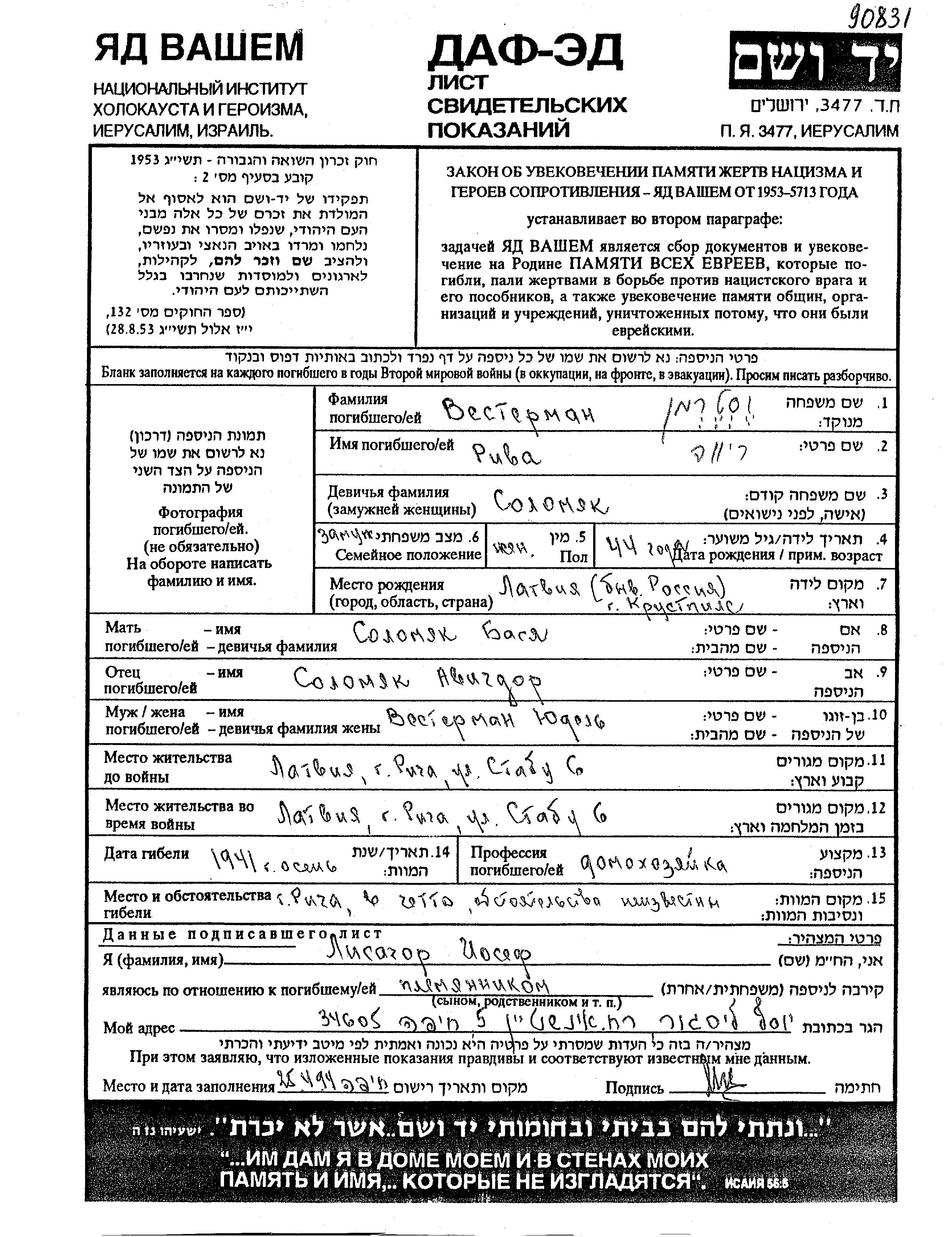 Riva Vesterman nee Solomyak was born in Krustpils, Latvia, 1897 to Avigdor and Basia. She was a housewife and married to Yudel. Prior to WWII she lived in Riga, Latvia. During the war she was in Riga, Latvia. Riva was murdered in the Shoah. Place of death: Riga, Latvia, 1941.