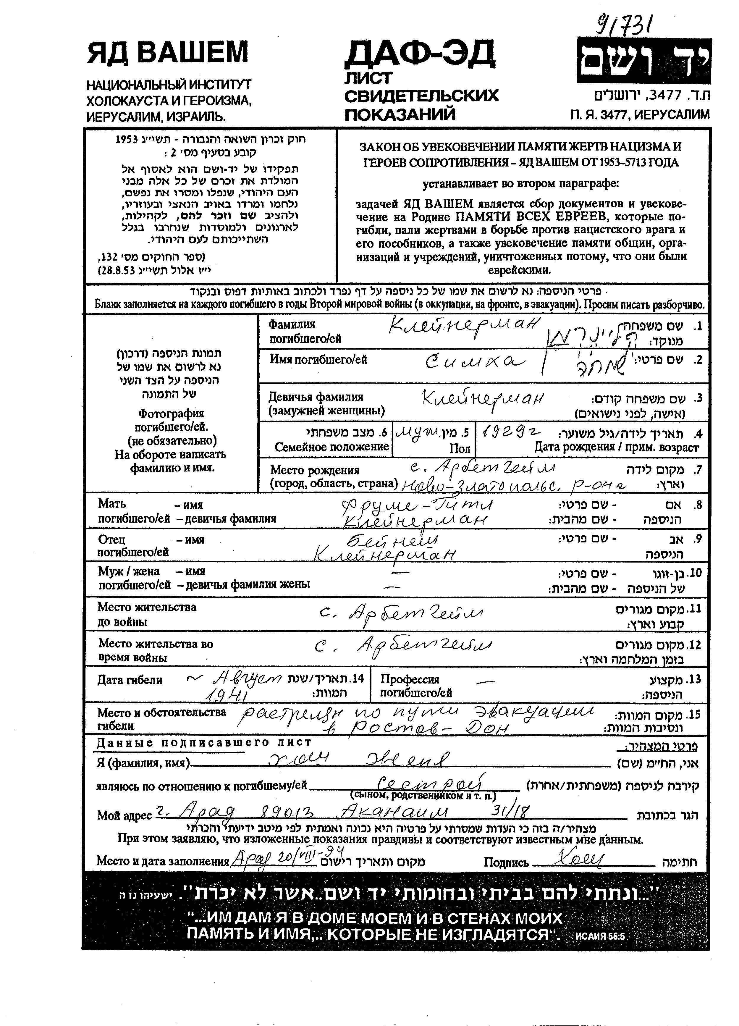 Simkha Kleynerman was born in Arbeytgeym, Ukraine (USSR), 1929 to Beinesh and Frume Gitl. He was child. Prior to WWII he lived in Arbeytgeym, Ukraine (USSR). During the war he was in Arbeytgeym, Ukraine (USSR). Simkha was murdered in the Shoah. Place of death: Rostov na Donu, Russia (USSR), 1941.