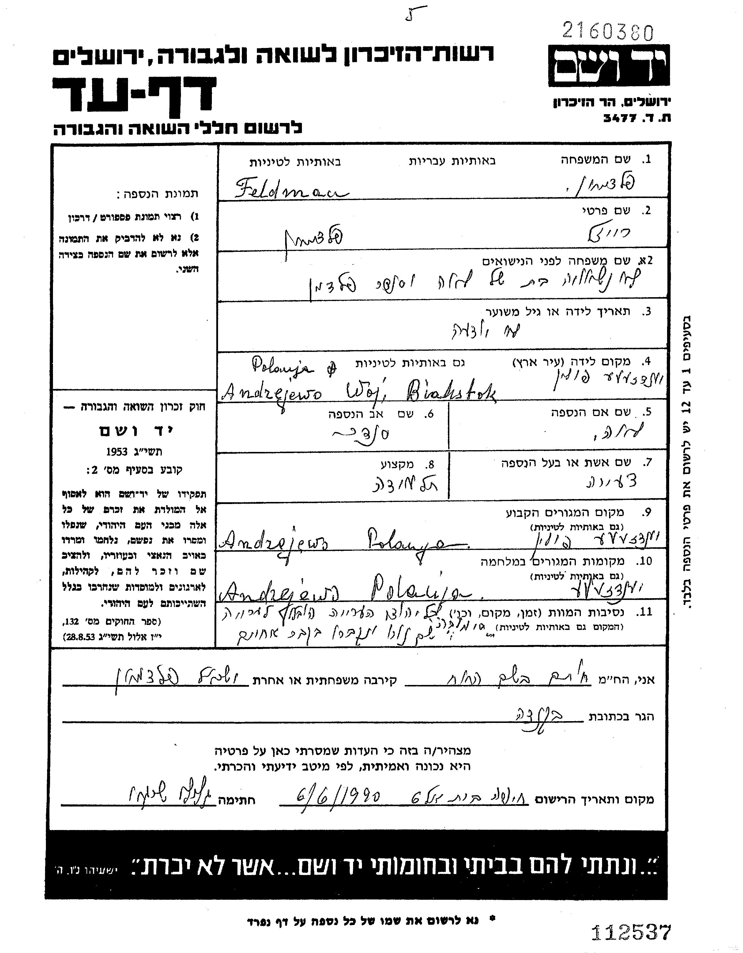 Reizl Feldman was born in Andrzejewo, Poland to Sender and Lea nee Lewinski. She was a pupil and child. Prior to WWII she lived in Andrzejewo, Poland. During the war she was in Andrzejewo, Poland. Reizl was murdered in the Shoah. Place of death: Szumowo, Poland.