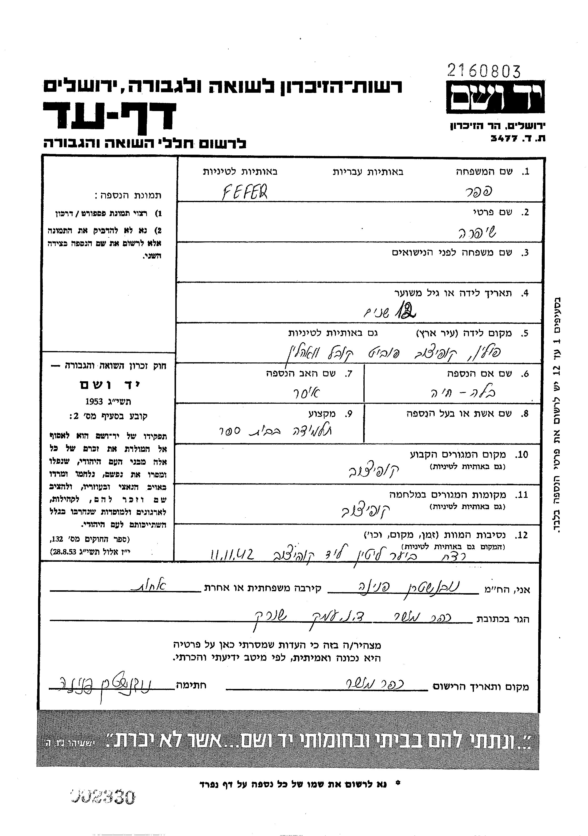 Shifra Fefer was born in Kupiczow, Poland to Isser and Bela Khaia. She was a pupil and child. Prior to WWII she lived in Kupiczow, Poland. During the war she was in Kupiczow, Poland. Shifra was murdered in the Shoah. Place of death: Litin, Ukraine (USSR), 11/11/1942.