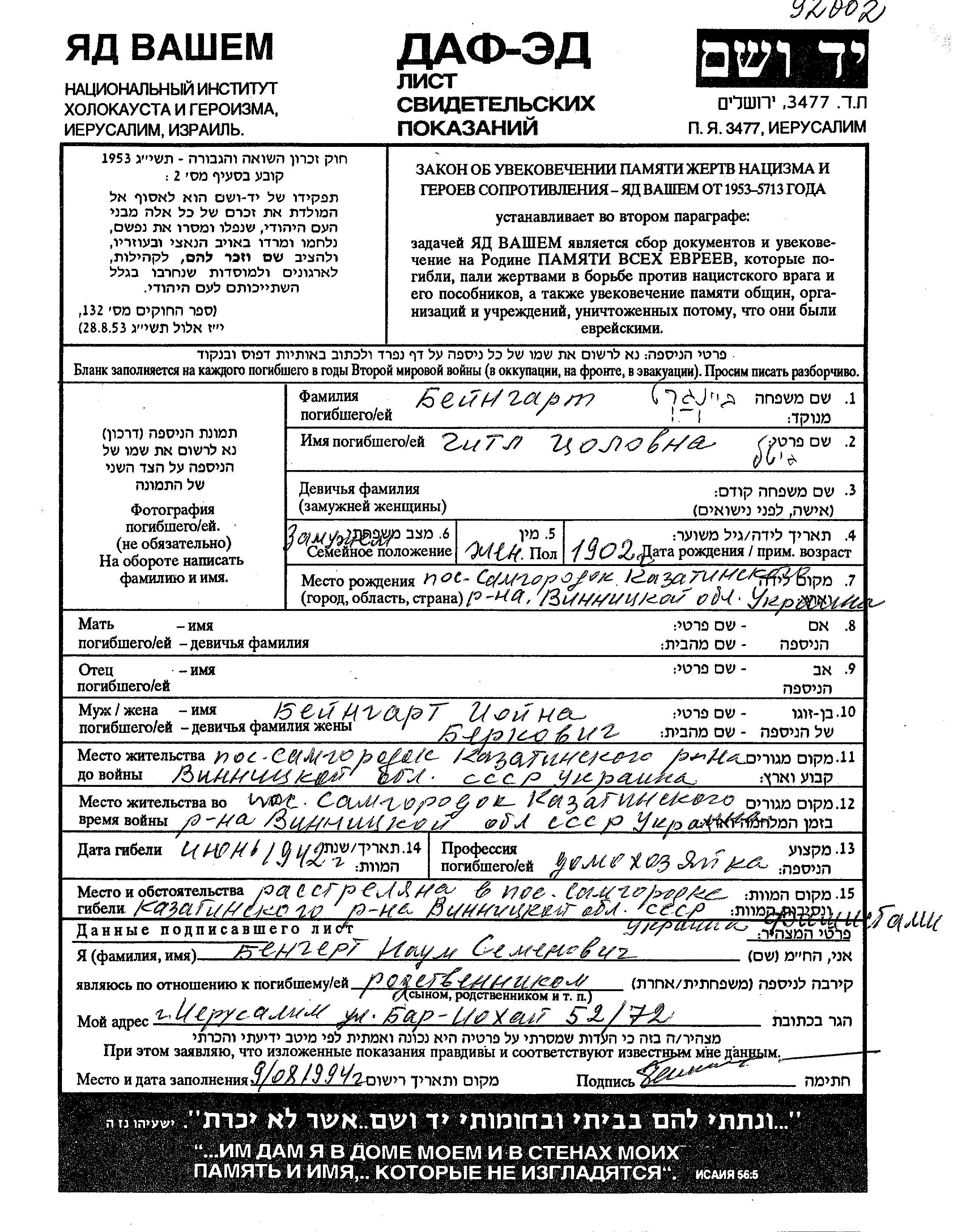 Gitl Beingart was born in Samgorodok, Ukraine (USSR), 1902 to Tzol. She was a housewife and married to Ioyna. Prior to WWII she lived in Samgorodok, Ukraine (USSR). During the war she was in Samgorodok, Ukraine (USSR). Gitl was murdered in the Shoah. Place of death: Samgorodok, Ukraine (USSR), 1942.