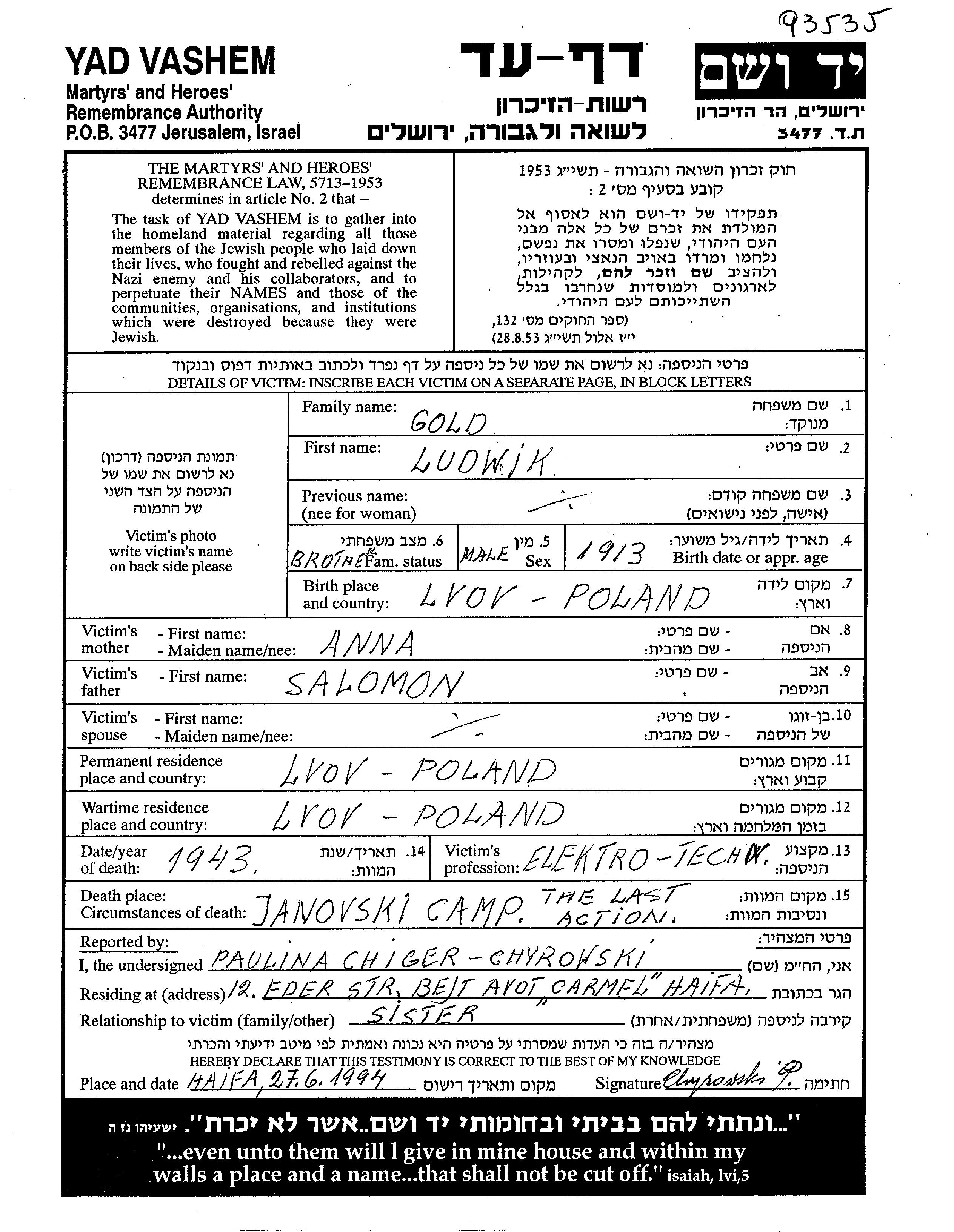 Gold Ludwik 1913 Lwow, Poland Page of Testimony