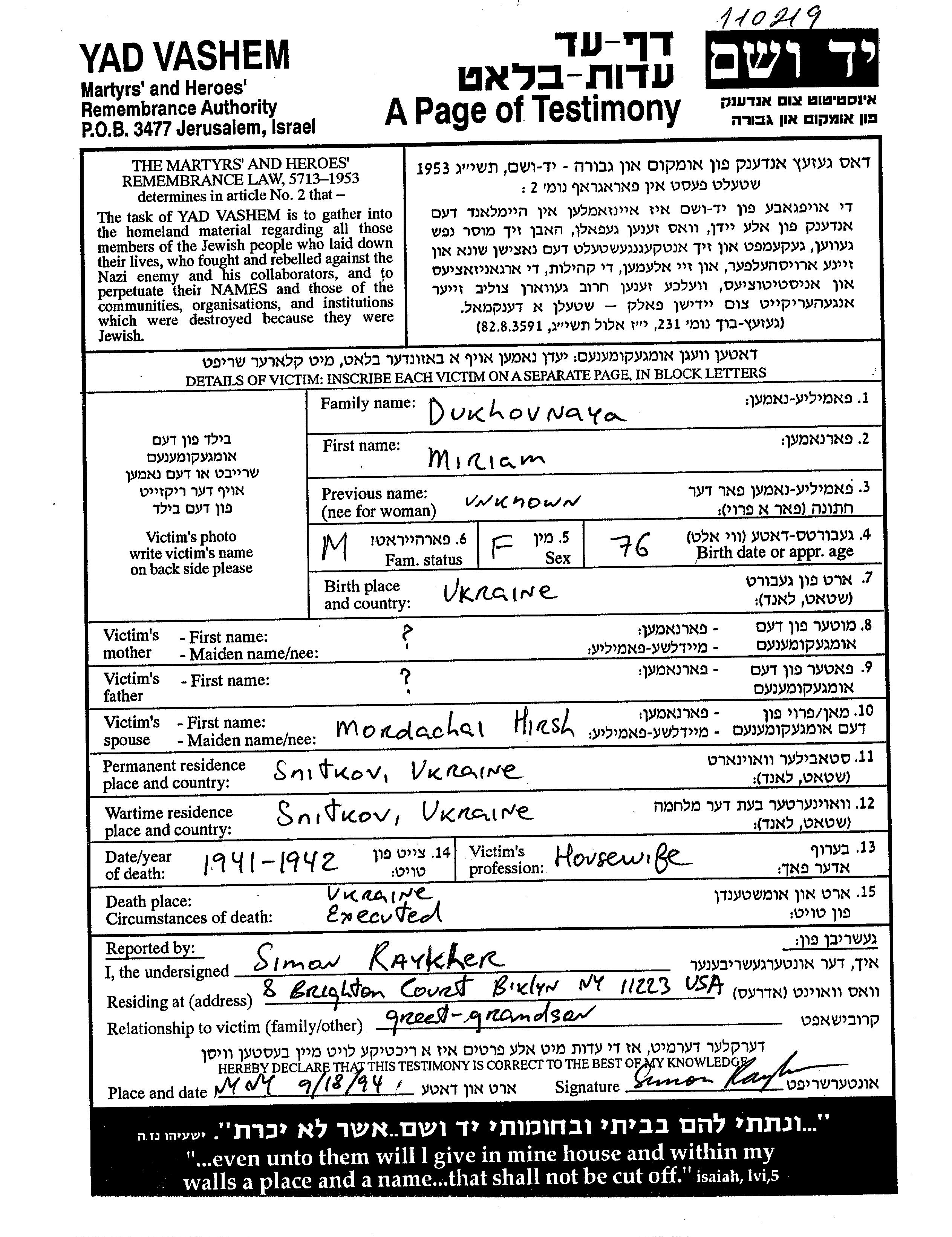 Miriam Dukhovni was born in Ukraine (USSR), 1866. She was a housewife and married to Mordachai Hirsh. Prior to WWII she lived in Snitkov, Ukraine (USSR). During the war she was in Snitkov, Ukraine (USSR). Miriam was murdered in the Shoah. Place of death: Ukraine (USSR), 1942.