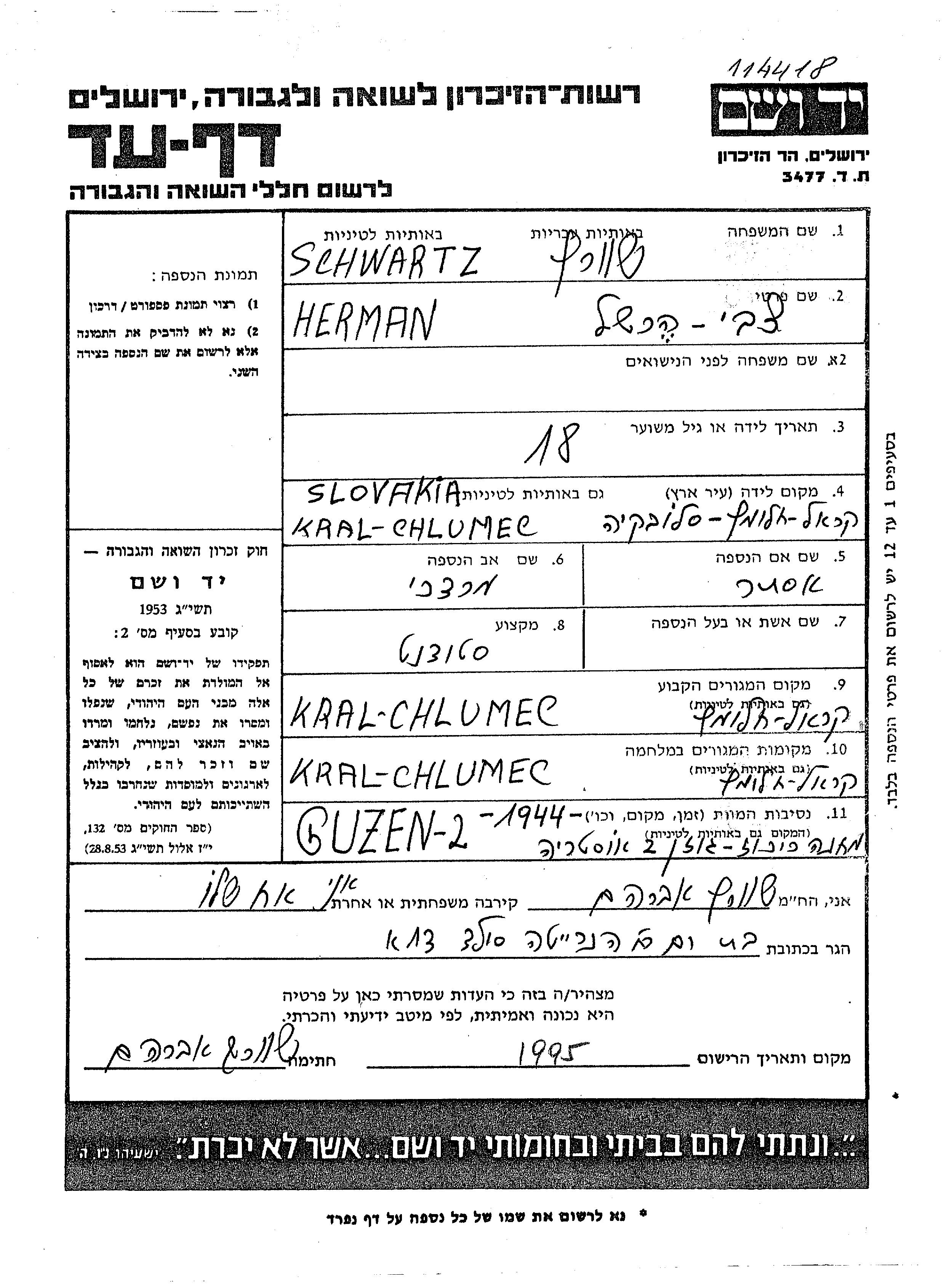 Schwartz Hershl Tzvi Herman 1926 Kralov Chlumec, Czechoslovakia Page of Testimony