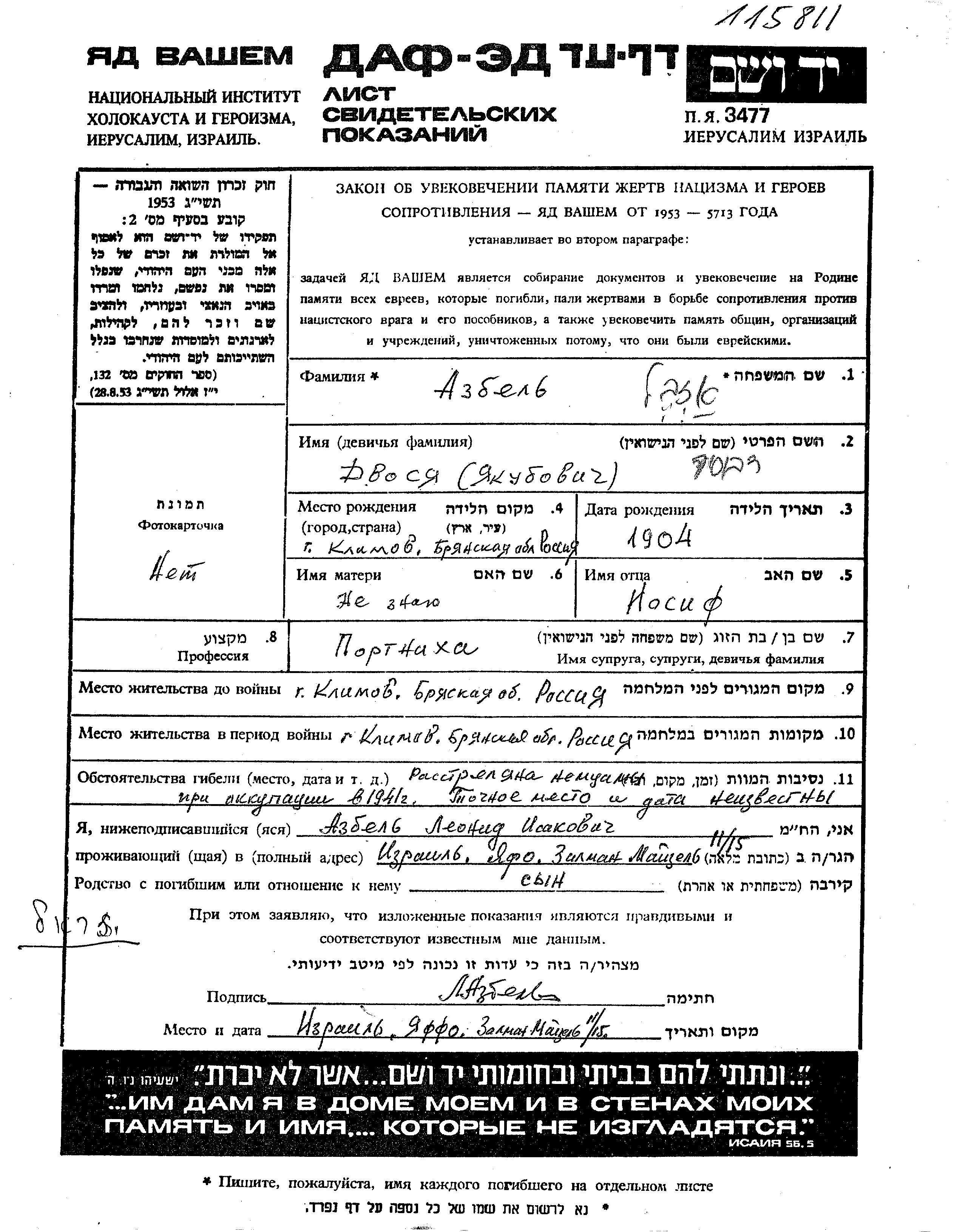 Dvosia Azbel nee Yakubovich was born in Klimovo, Russia (USSR), 1904 to Iosif. She was a tailor and married. Prior to WWII she lived in Klimovo, Russia (USSR). During the war she was in Klimovo, Russia (USSR). Dvosia was murdered in the Shoah. Place of death: unknown, 1941.