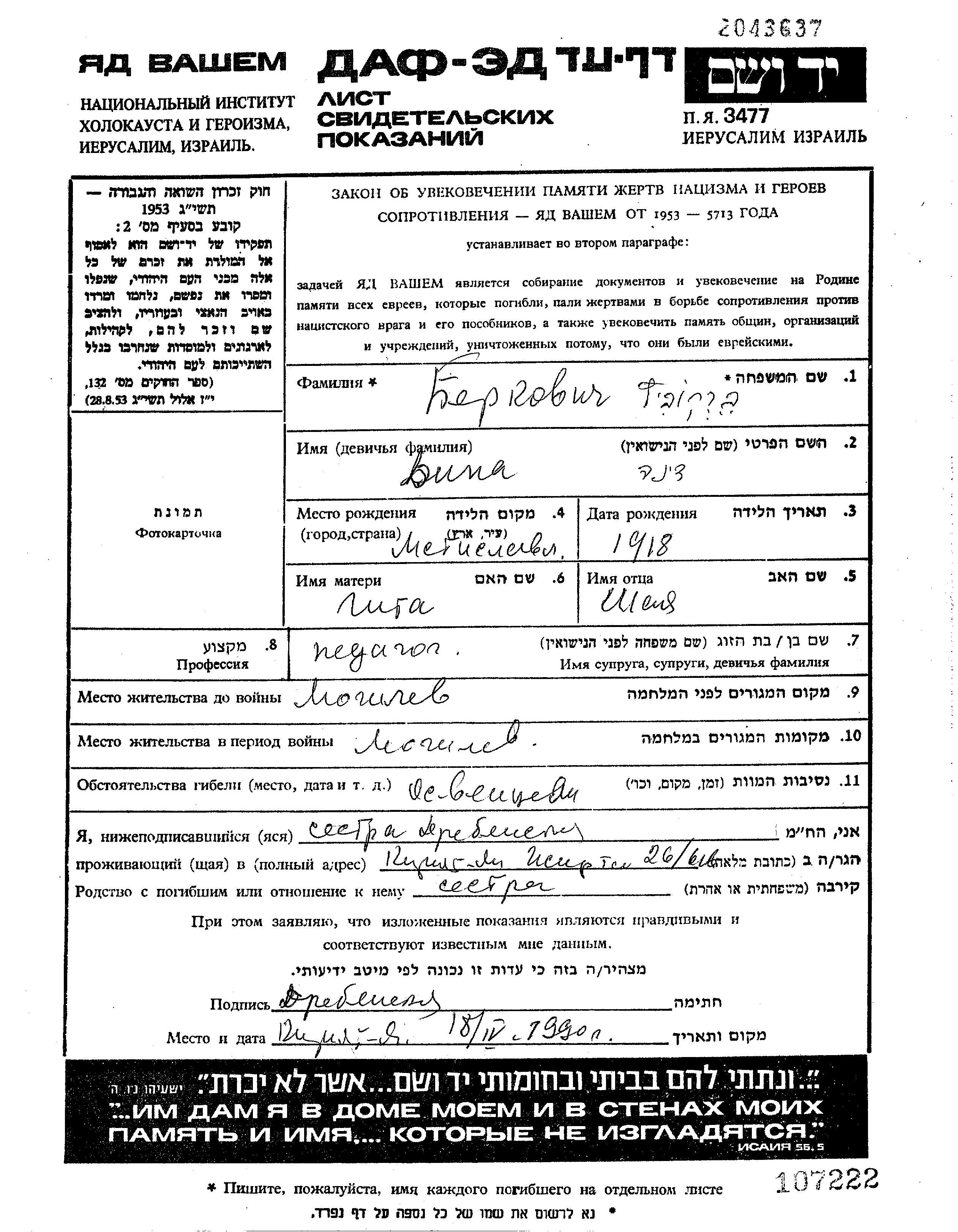 Berkovich Dina 1918 Mstislavl, Belorussia (USSR) Page of Testimony