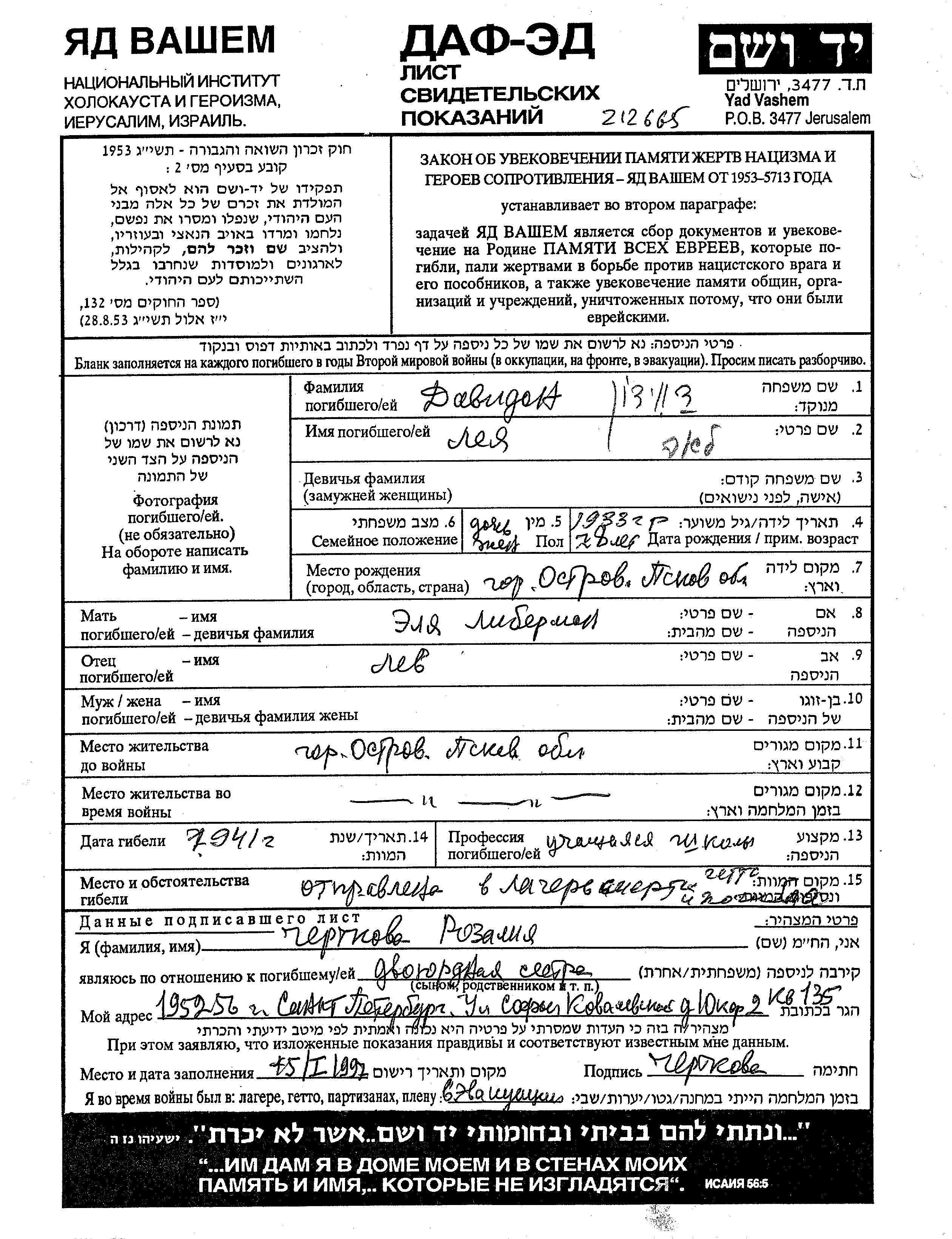 Lea Davidon was born in Ostrov, Russia (USSR), 1938 to Lev Leiba and Elya Alia nee Liberman. She was a pupil and child. Prior to WWII she lived in Ostrov, Russia (USSR). During the war she was in Ostrov, Russia (USSR). Lea was murdered in the Shoah. Place of death: unknown, 1941.