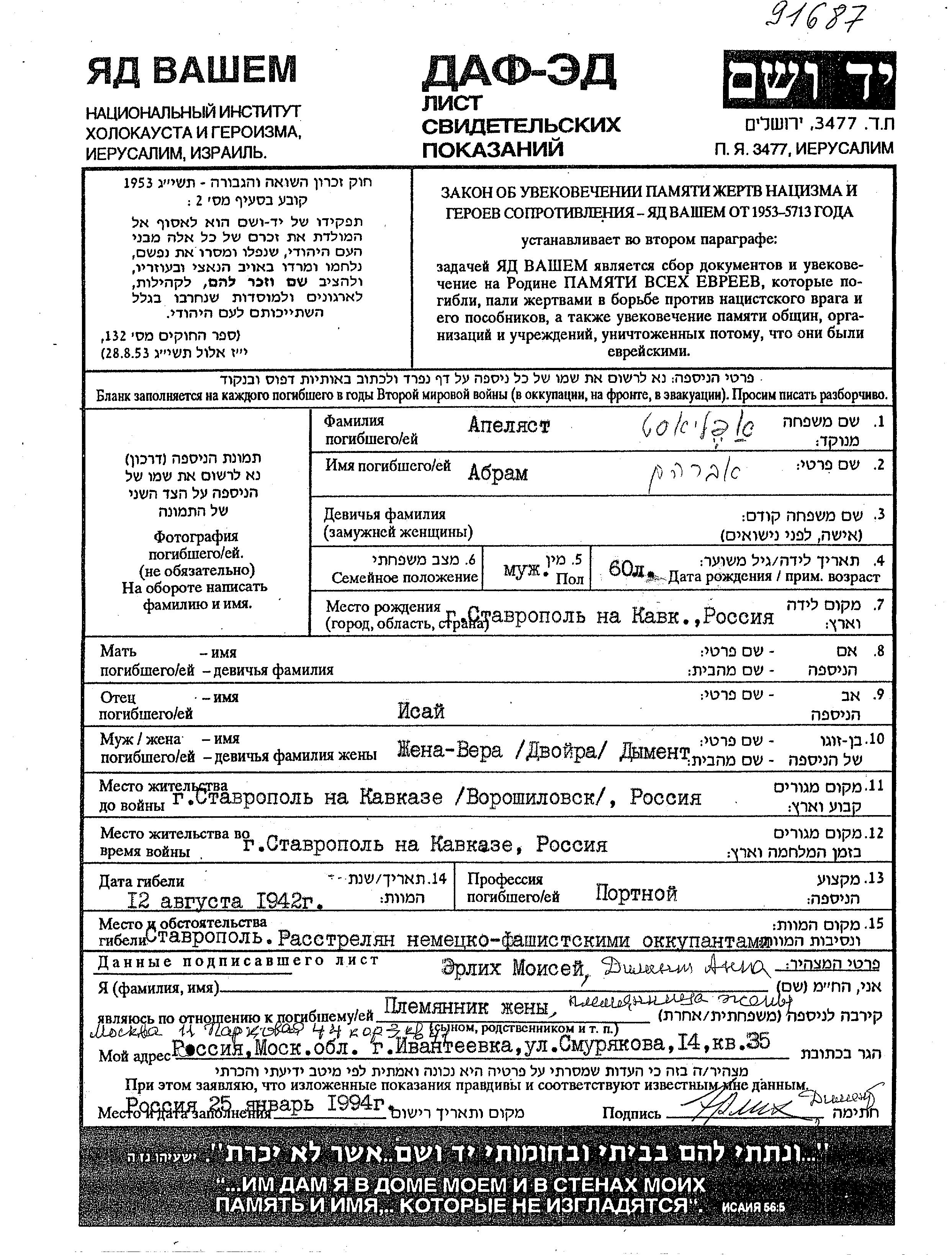 Apelyast Abram 1882 Stavropol, Russia (USSR) Page of Testimony