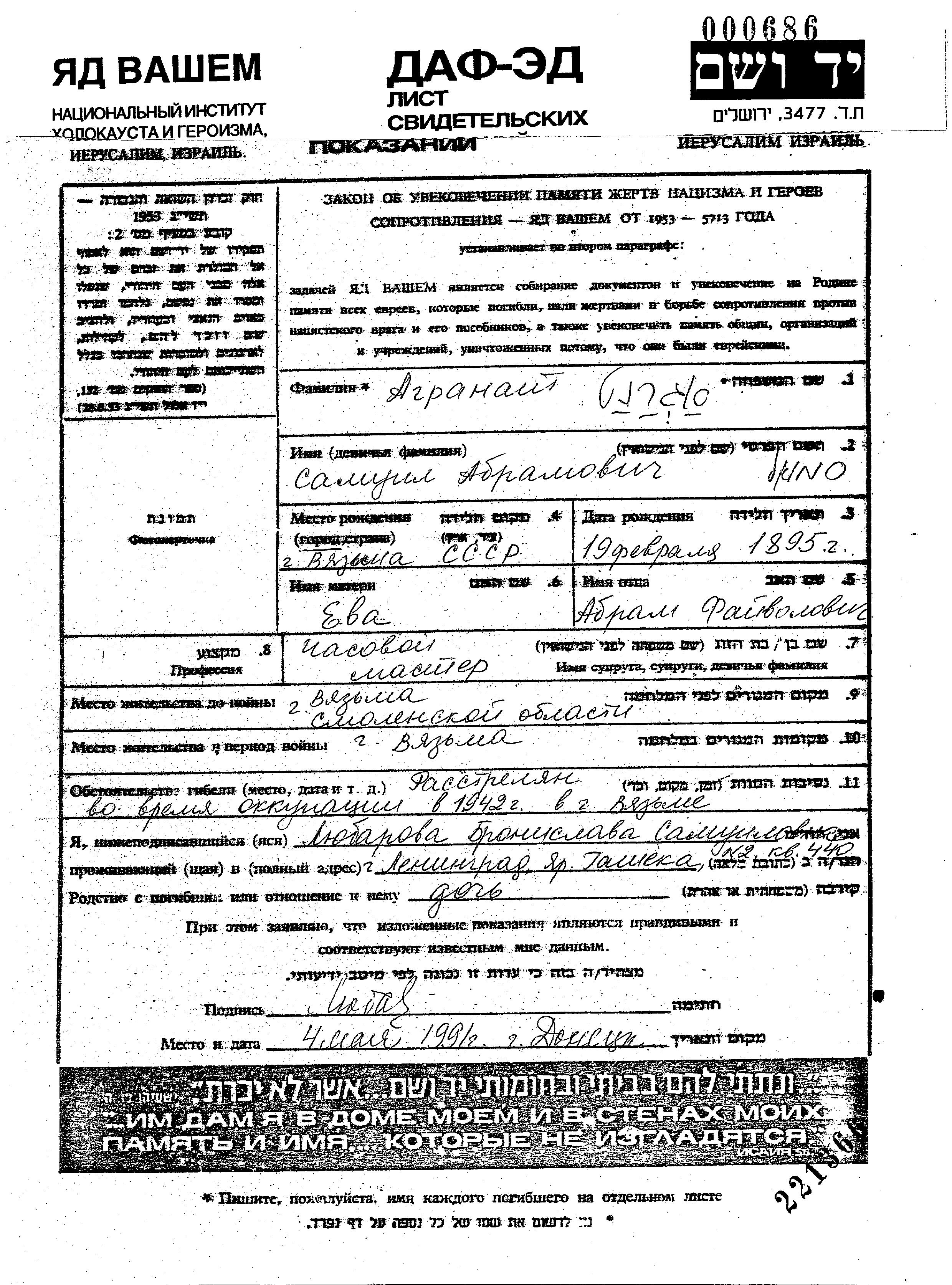 Agranat Samuil 1895 Vyazma, Russia (USSR) Page of Testimony