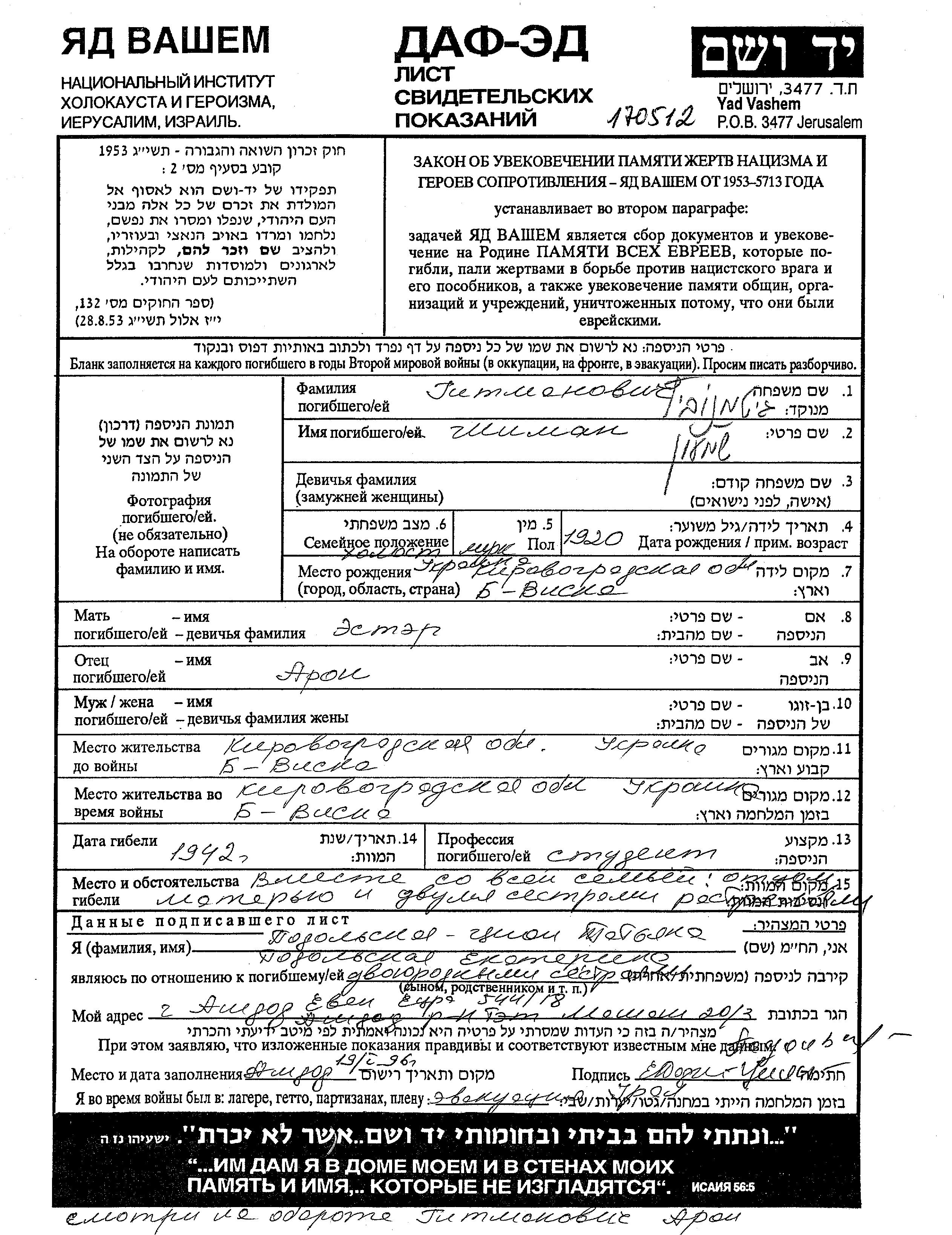 Shimon Gitmanovich was born in Velikaya Viska, Ukraine (USSR), 1920 to Aron and Ester. He was a student and single. Prior to WWII he lived in Velikaya Viska, Ukraine (USSR). During the war he was in Velikaya Viska, Ukraine (USSR). Shimon was murdered in the Shoah. Place of death: Velikaya Viska, Ukraine (USSR), 1942.