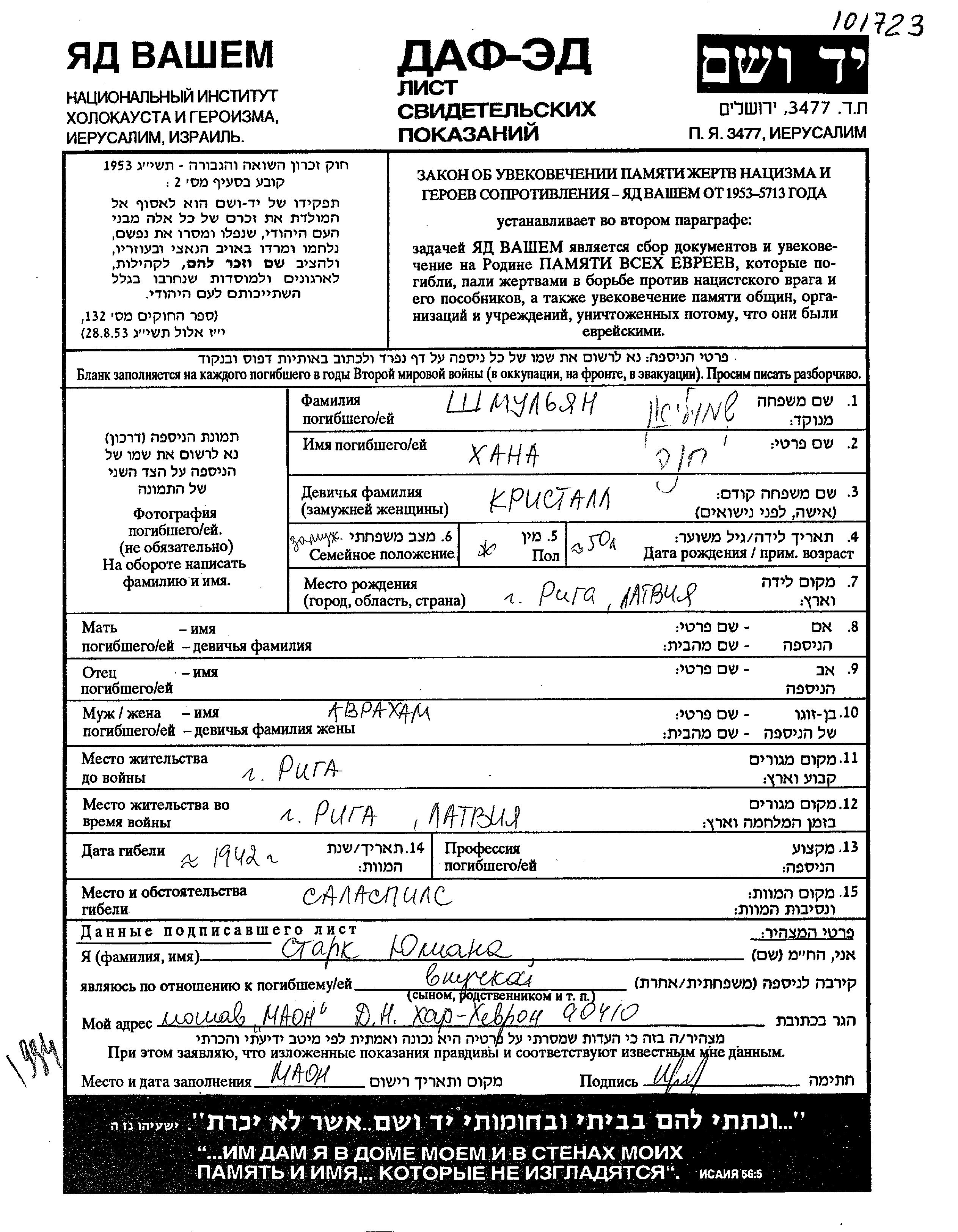 Khana Shmulyan nee Kristal was born in Riga, Latvia, 1892. She was married to Avraham. Prior to WWII she lived in Riga, Latvia. During the war she was in Riga, Latvia. Khana was murdered in the Shoah. Place of death: Salaspils, Latvia, 1942.