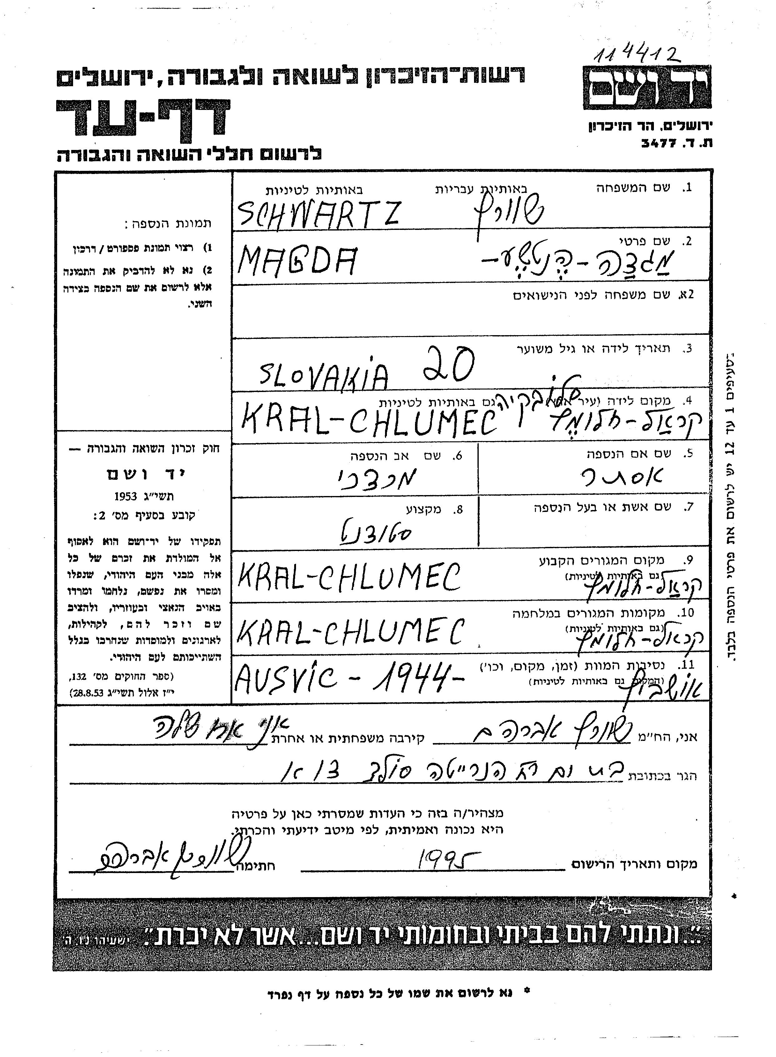 Schwartz Magda Hantza 1924 Kralov Chlumec, Czechoslovakia Page of Testimony
