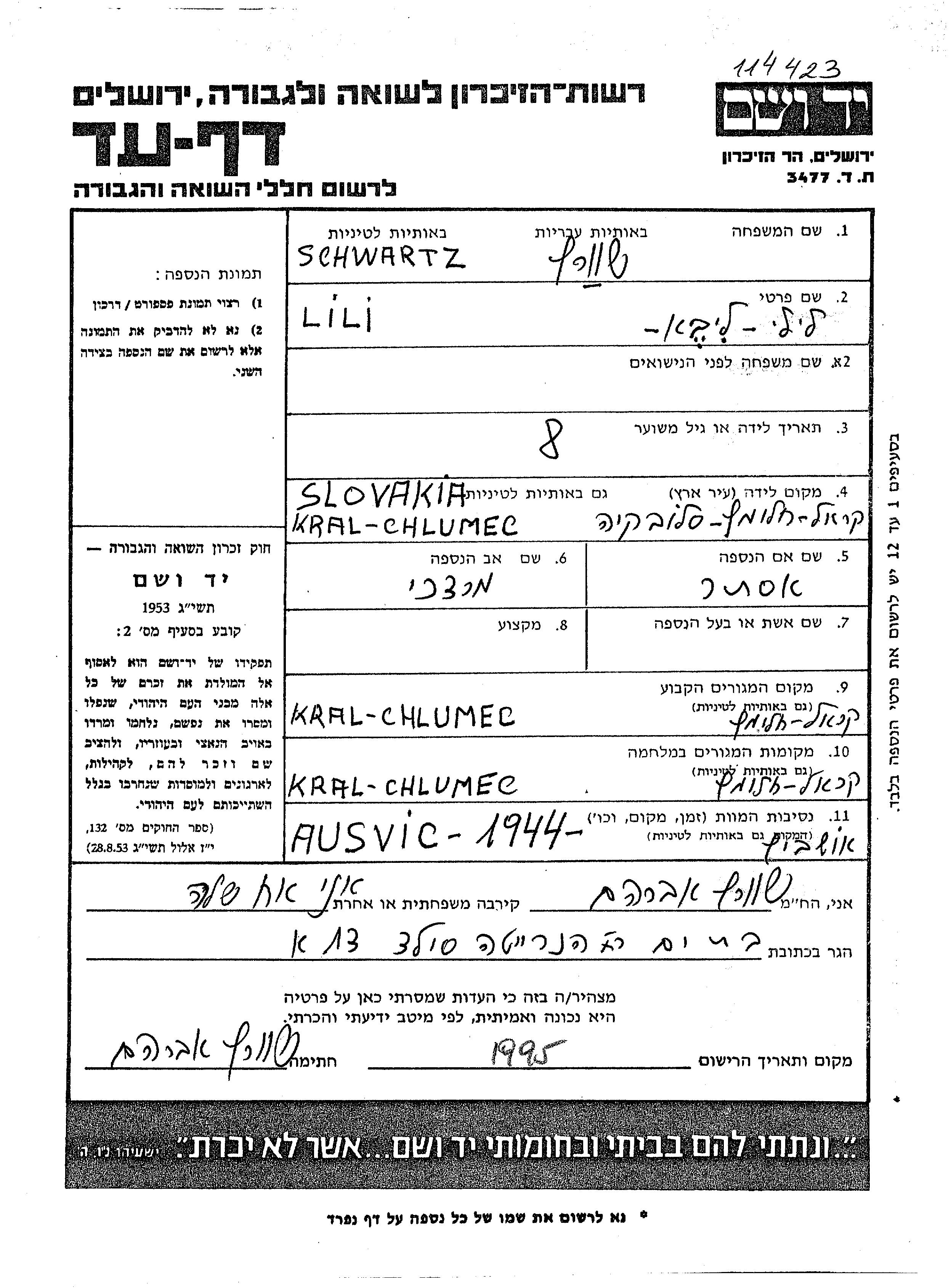 Schwartz Lili Liba 1936 Kralov Chlumec, Czechoslovakia Page of Testimony