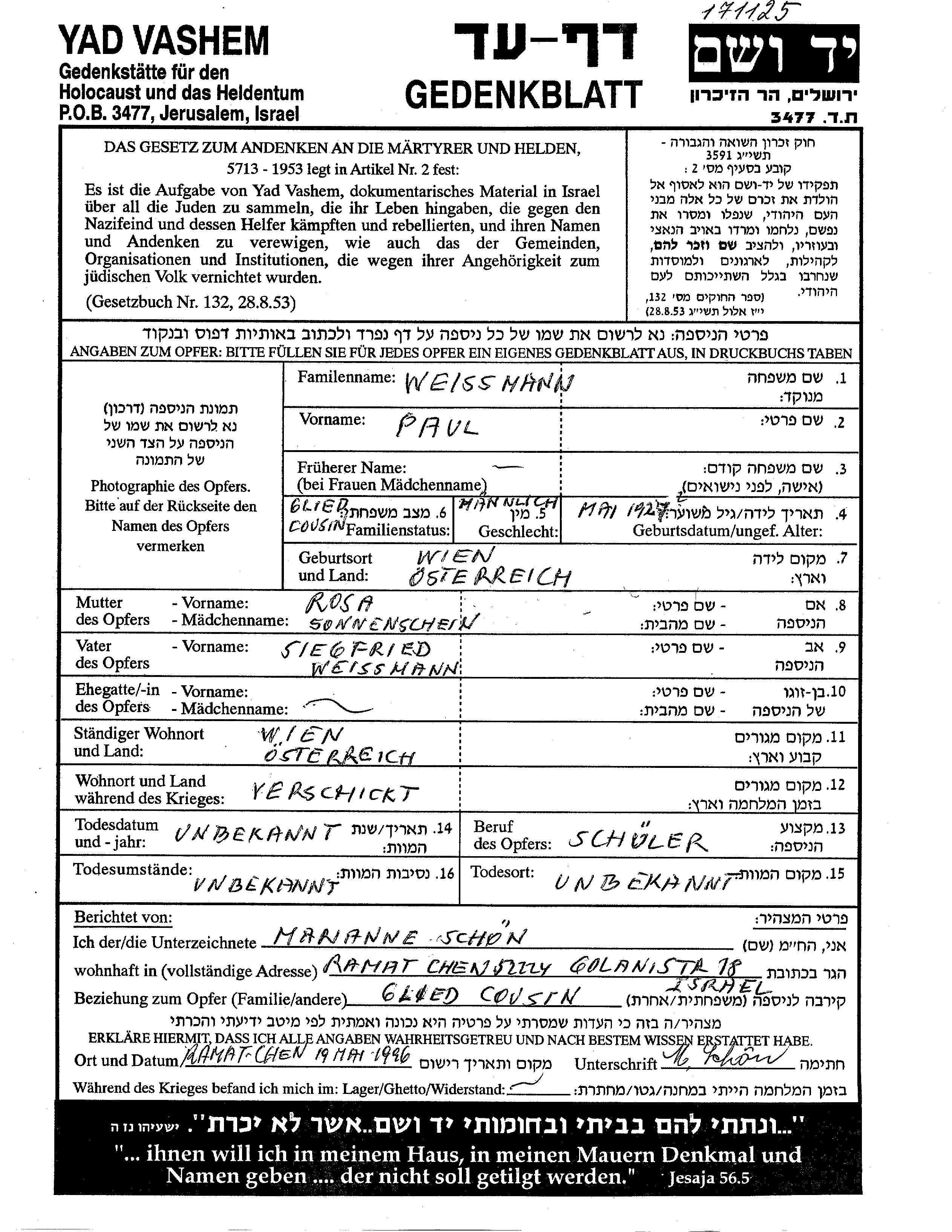 Weissmann Paul 1927 Wien, Austria Page of Testimony