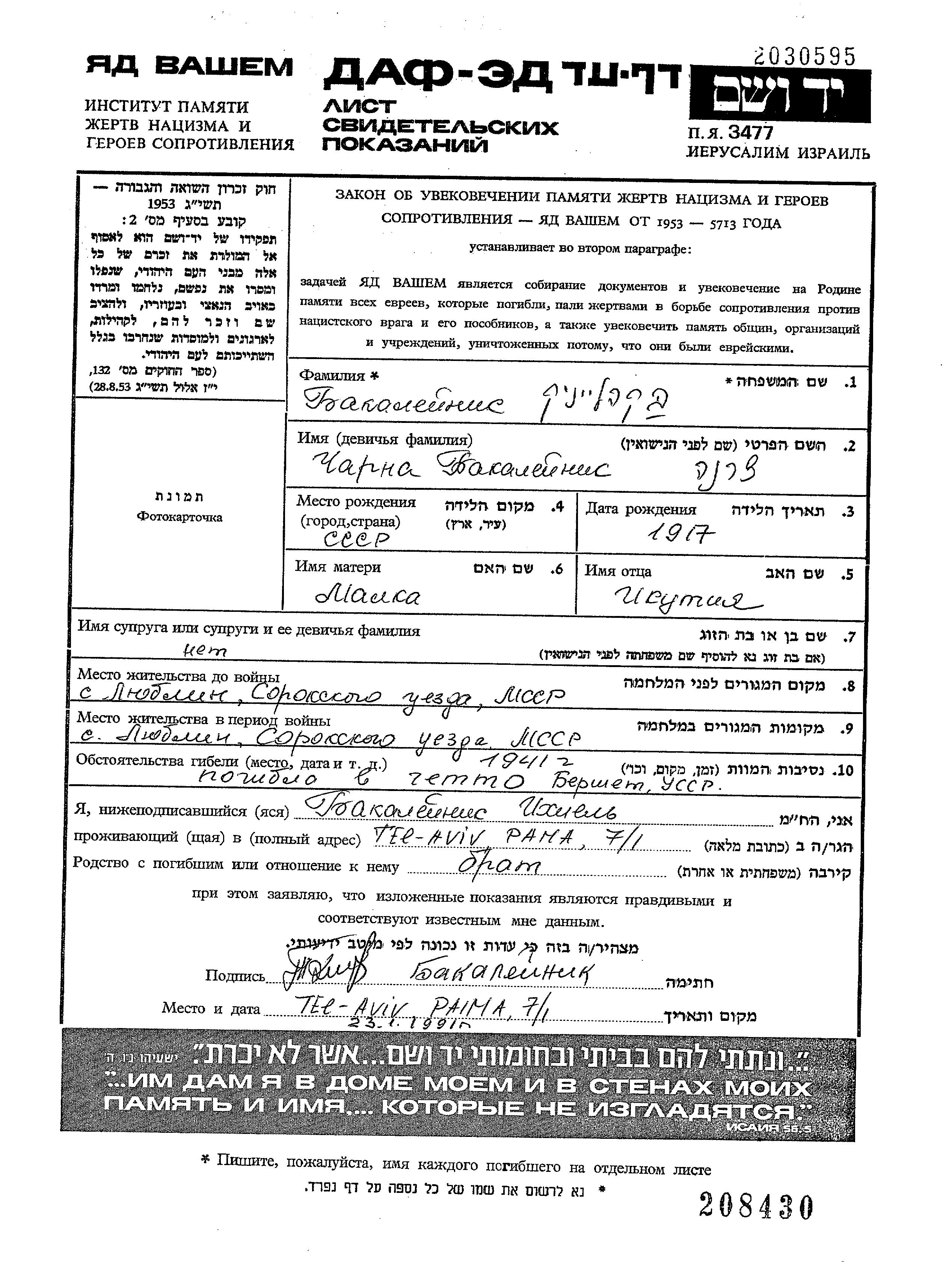 Charna Bakaleinik was born, 1917 to Ikutiya and Malka nee Tzikerman. She was single. Prior to WWII she lived in Liublin, Romania. During the war she was in Liublin, Romania. Charna was murdered in the Shoah. Place of death: Bershad, Ukraine (USSR), 1941.