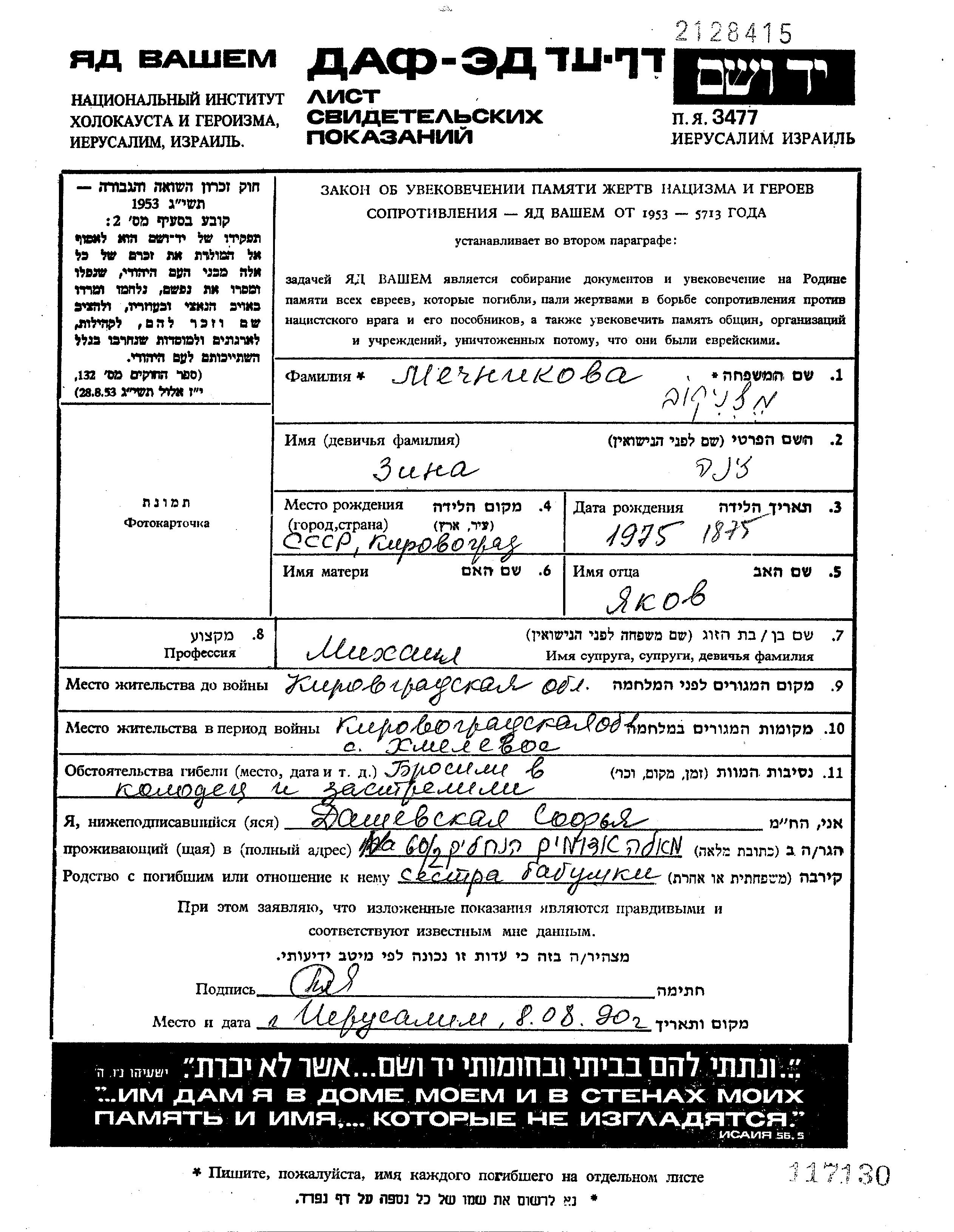 Mechnikov Zinaida Khmelevoye, Ukraine (USSR) Page of Testimony