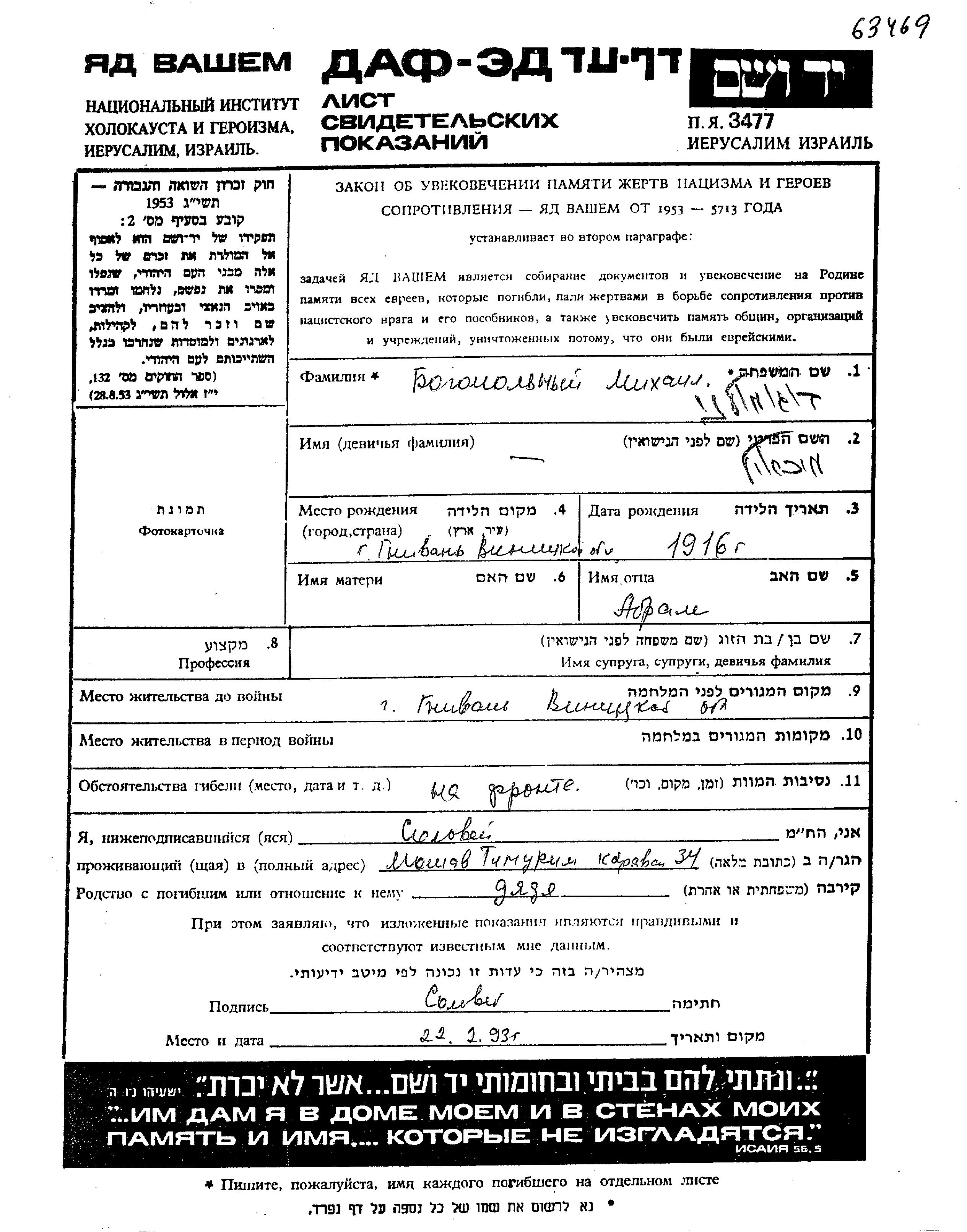 Mikhail Bogomolni was born in Gnivan, Ukraine (USSR), 1916 to Abram. Prior to WWII he lived in Gnivan, Ukraine (USSR). During the war he was in the Soviet armed forces. Mikhail was killed in military service in WWII.