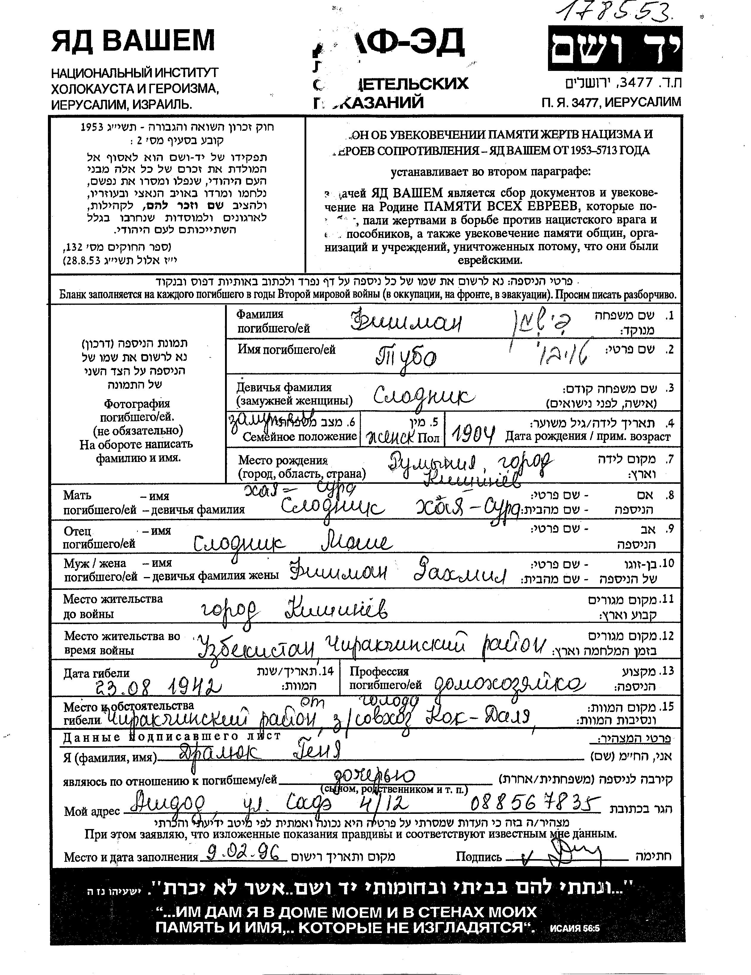 Tuba Fishman nee Slodnik was born in Kishinev, Romania, 1904 to Moshe and Khaia Sura. She was a housewife and married to Rakhmil. Prior to WWII she lived in Kishinev, Romania. During the war she was in Uzbekistan (USSR). Tuba was registered following the evacuation/ in the interior of the Soviet Union.