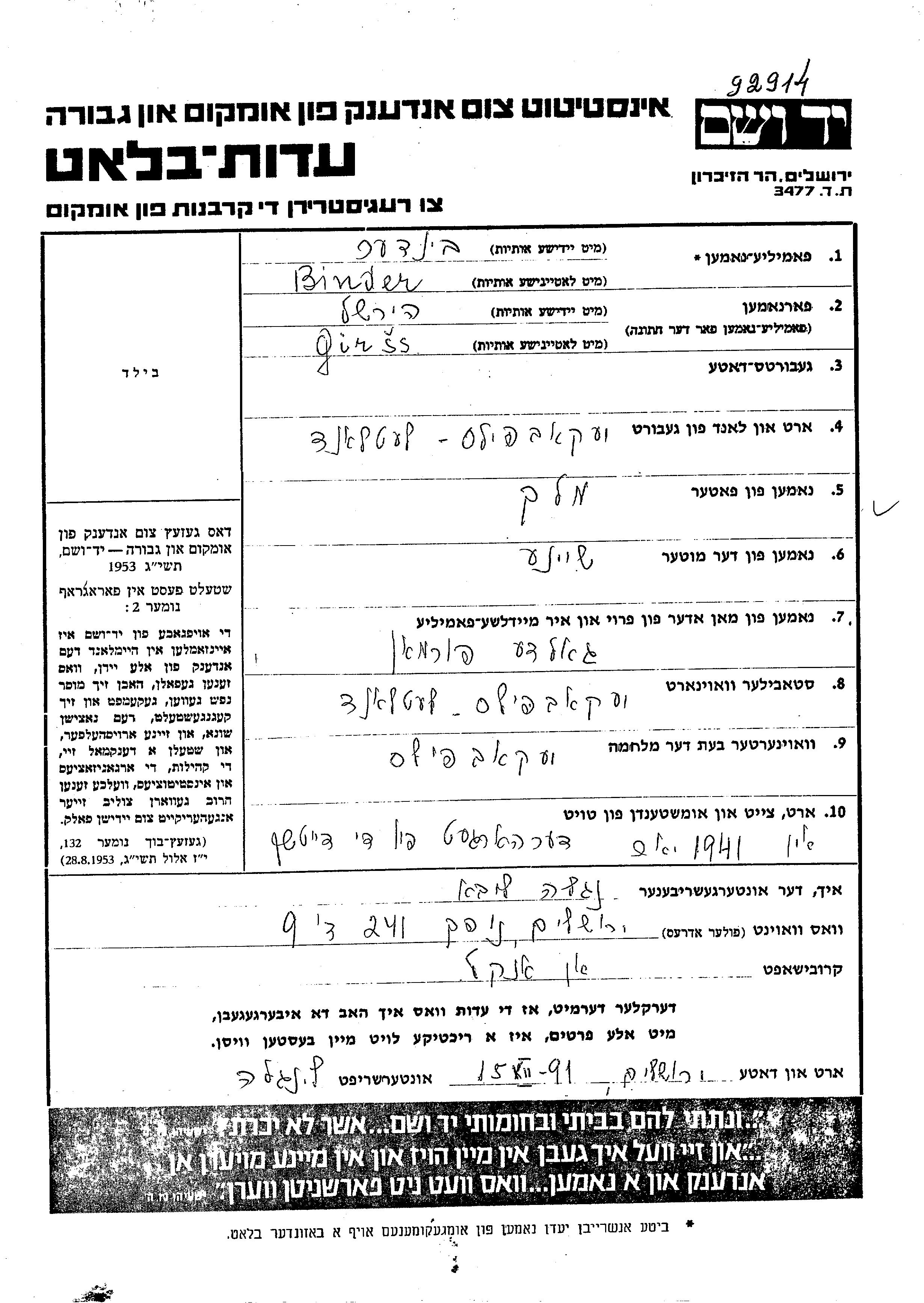 Girss Binder was born in Jekabpils, Latvia to Meilech and Sheine. He was married to Golda. Prior to WWII he lived in Jekabpils, Latvia. During the war he was in Jekabpils, Latvia.