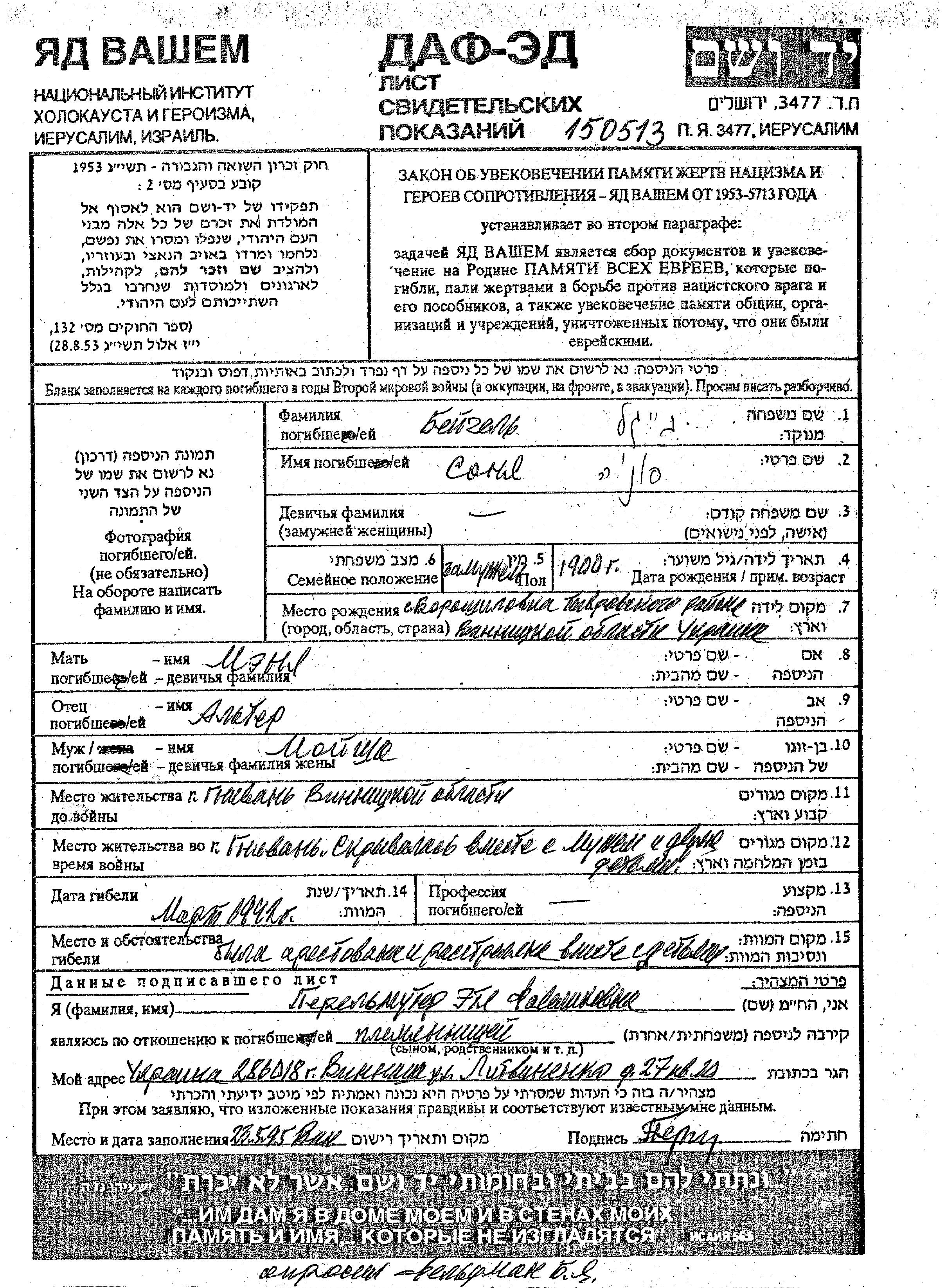 Sonia Beygel was born in Voroshilovka, Ukraine (USSR), 1900 to Alter and Menia Mania. She was married to Moisha. Prior to WWII she lived in Gnivan, Ukraine (USSR). During the war she was in Gnivan, Ukraine (USSR). Sonia was murdered in the Shoah. Place of death: unknown, 1942.