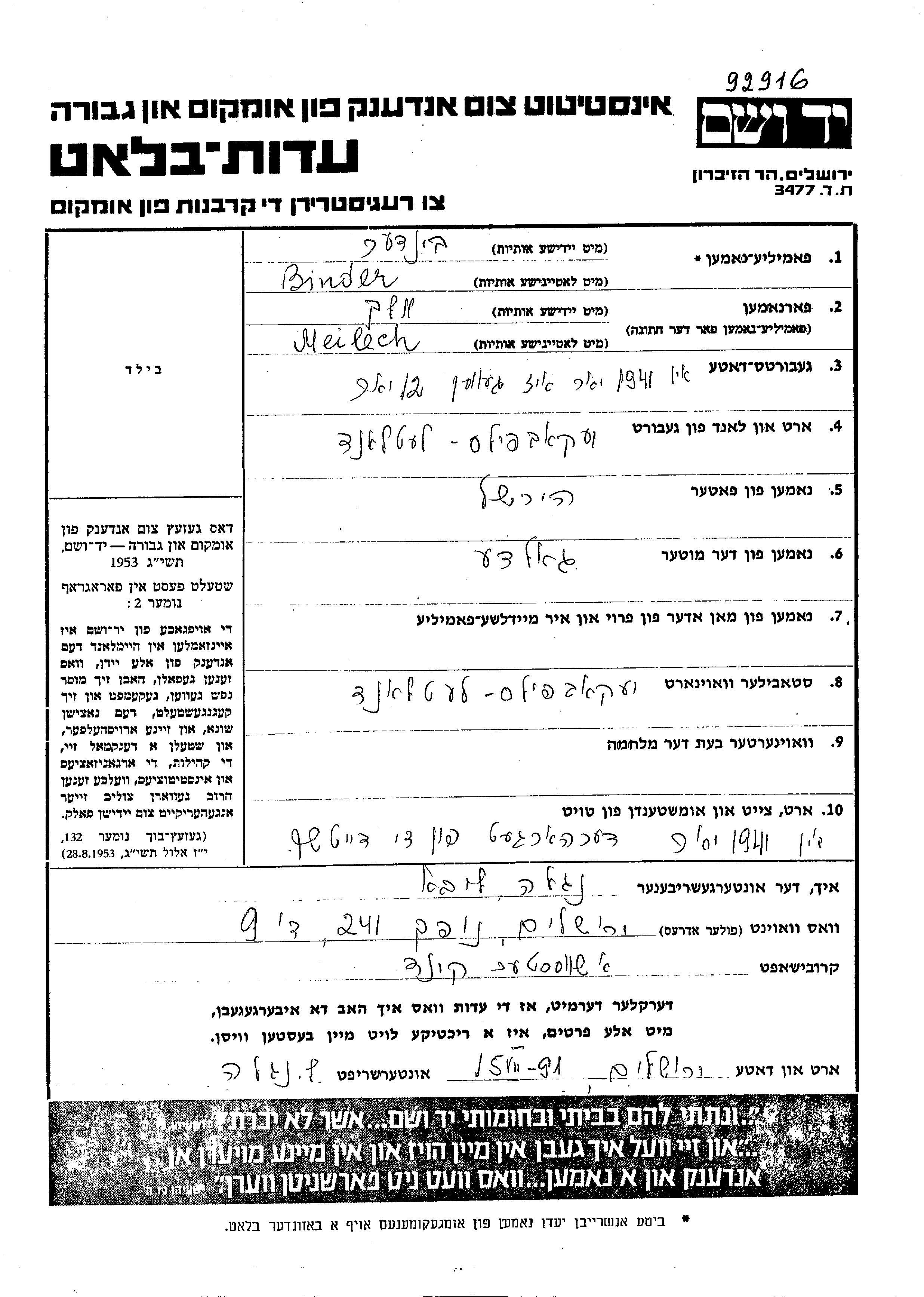 Meilech Binder was born in Jekabpils, Latvia, 1929 to Girss and Golda nee Furman. He was child. Prior to WWII he lived in Jekabpils, Latvia. During the war he was in Jekabpils, Latvia. Meilech was murdered in the Shoah. Place of death: Latvia, 1941.
