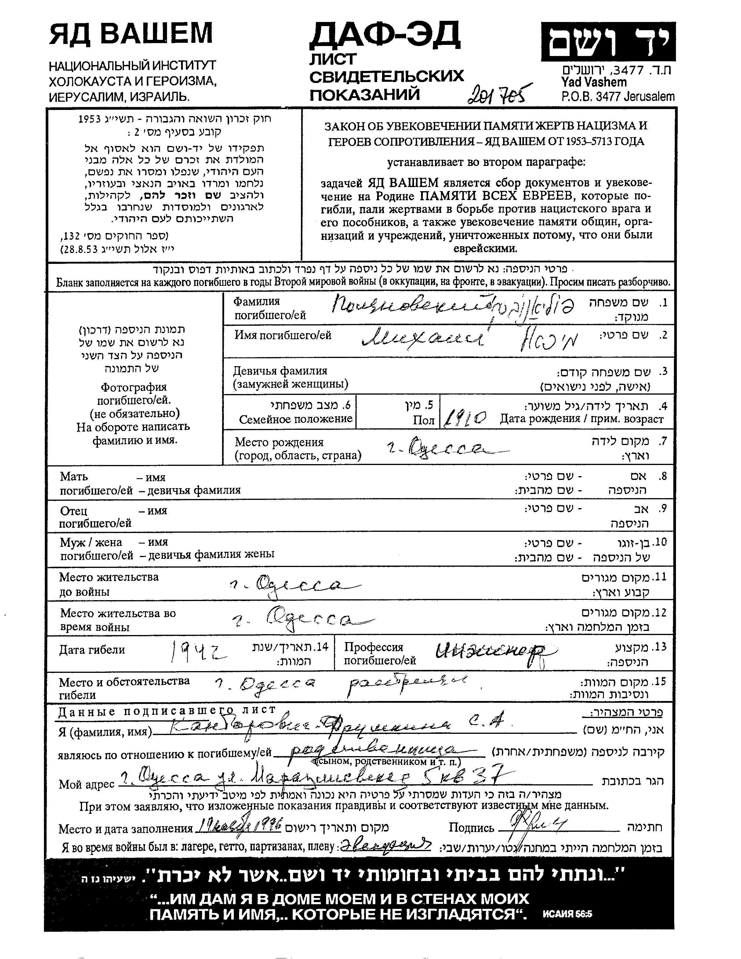 Mikhail Polyanovski was born in Odessa, Ukraine (USSR), 1910. He was an engineer. Prior to WWII he lived in Odessa, Ukraine (USSR). During the war he was in Odessa, Ukraine (USSR). Mikhail was murdered in the Shoah. Place of death: Odessa, Ukraine (USSR), 1942.