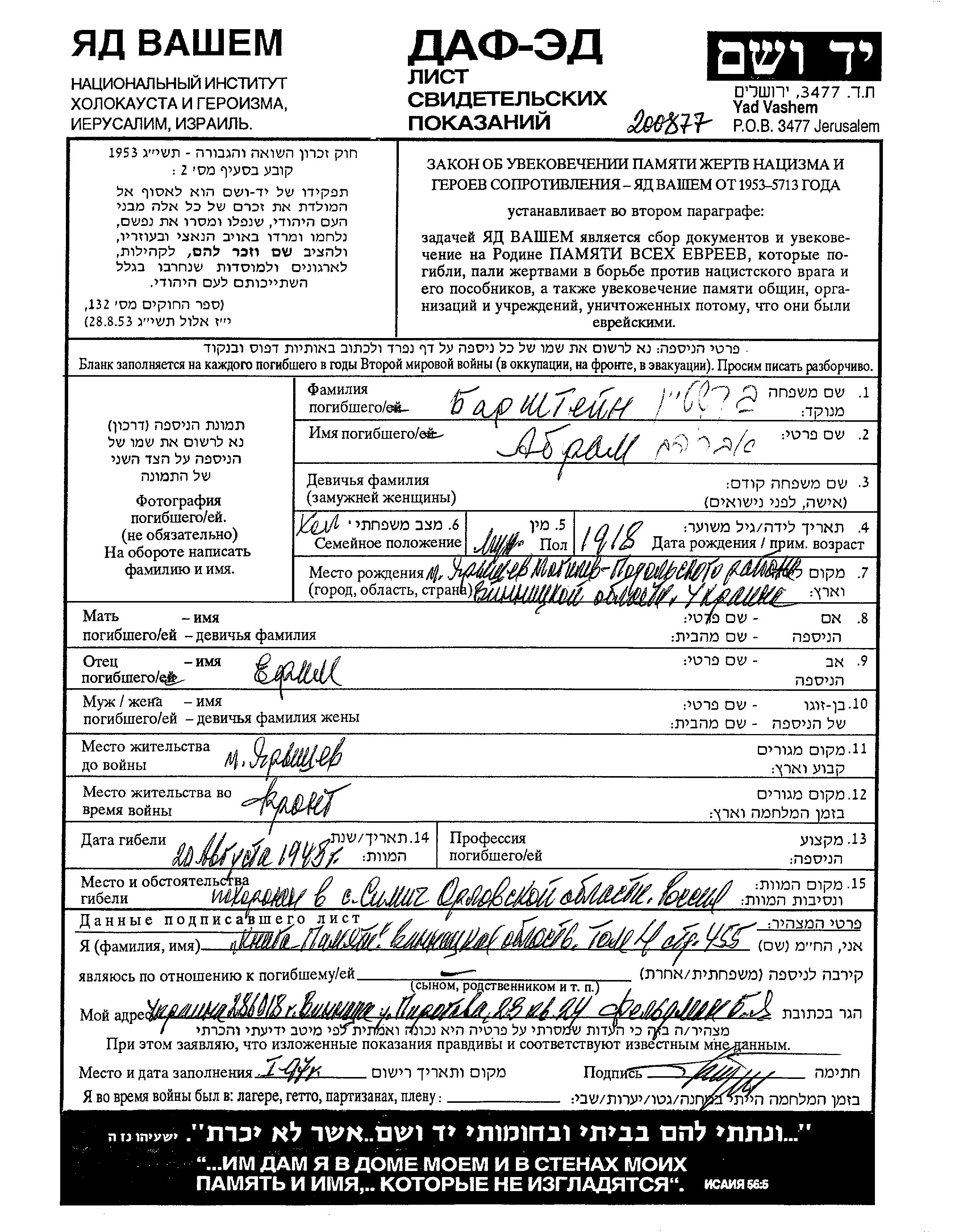 Barshtein Abram 1918 Yaryshev, Ukraine (USSR) Page of Testimony