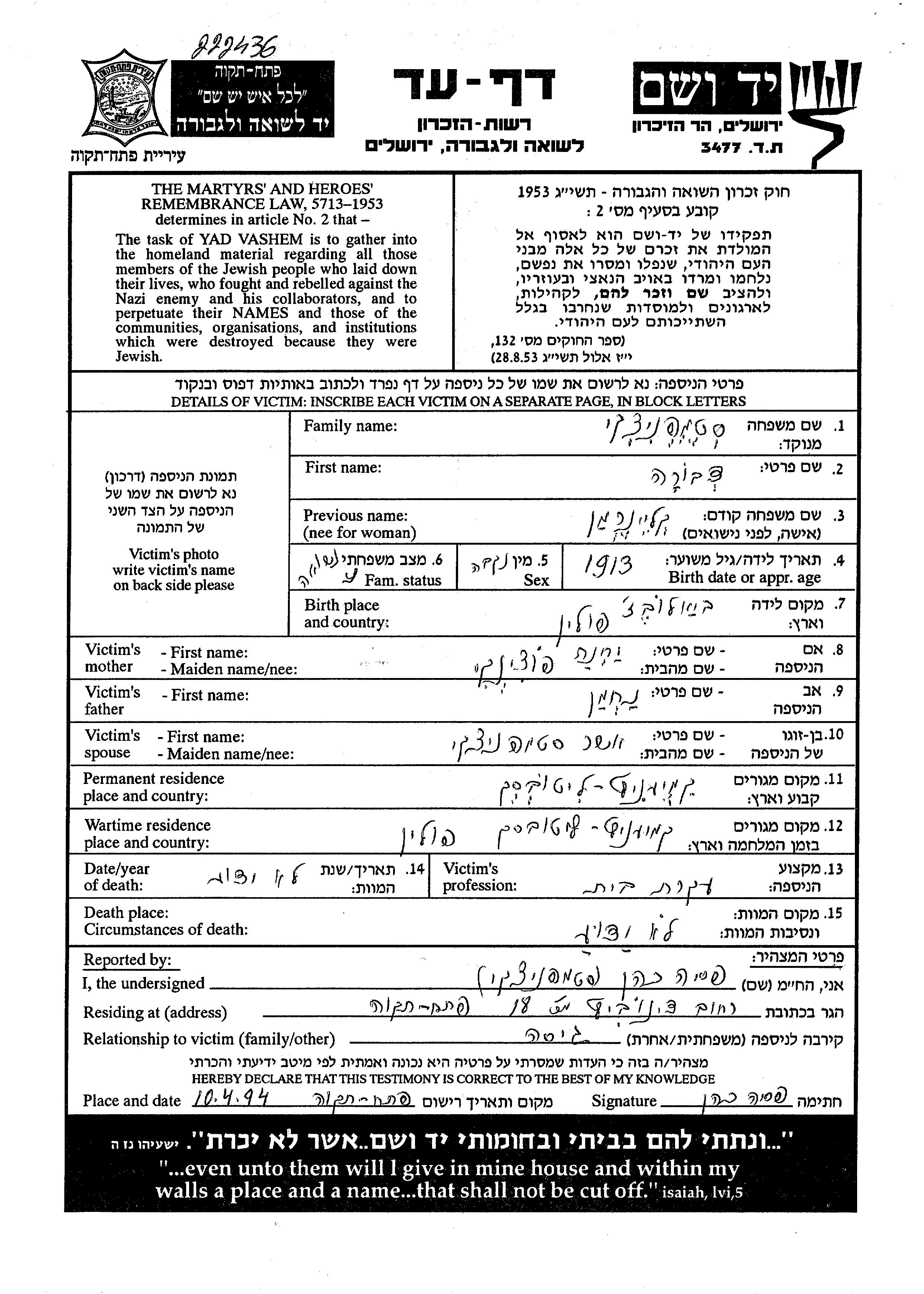 Dvora Stempnitzki nee Kleinerman was born in Bialowieza, Poland, 1913 to Nakhman and Yakhna nee Pochinka. She was a housewife and married to Asher. Prior to WWII she lived in Kamieniec Litewski, Poland. During the war she was in Kamieniec Litewski, Poland. Dvora was murdered in the Shoah.