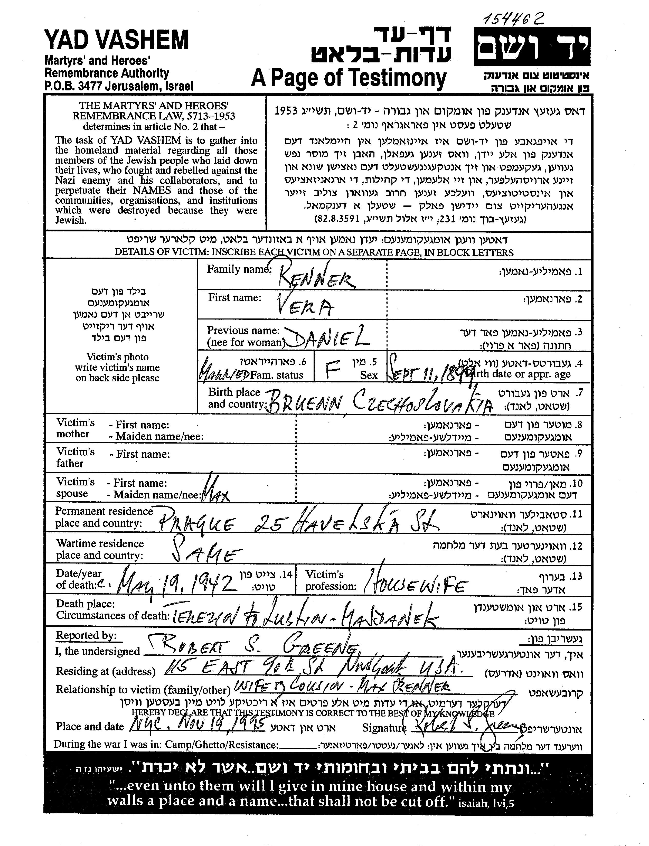 Renner Vera 1899 Praha, Czechoslovakia Page of Testimony