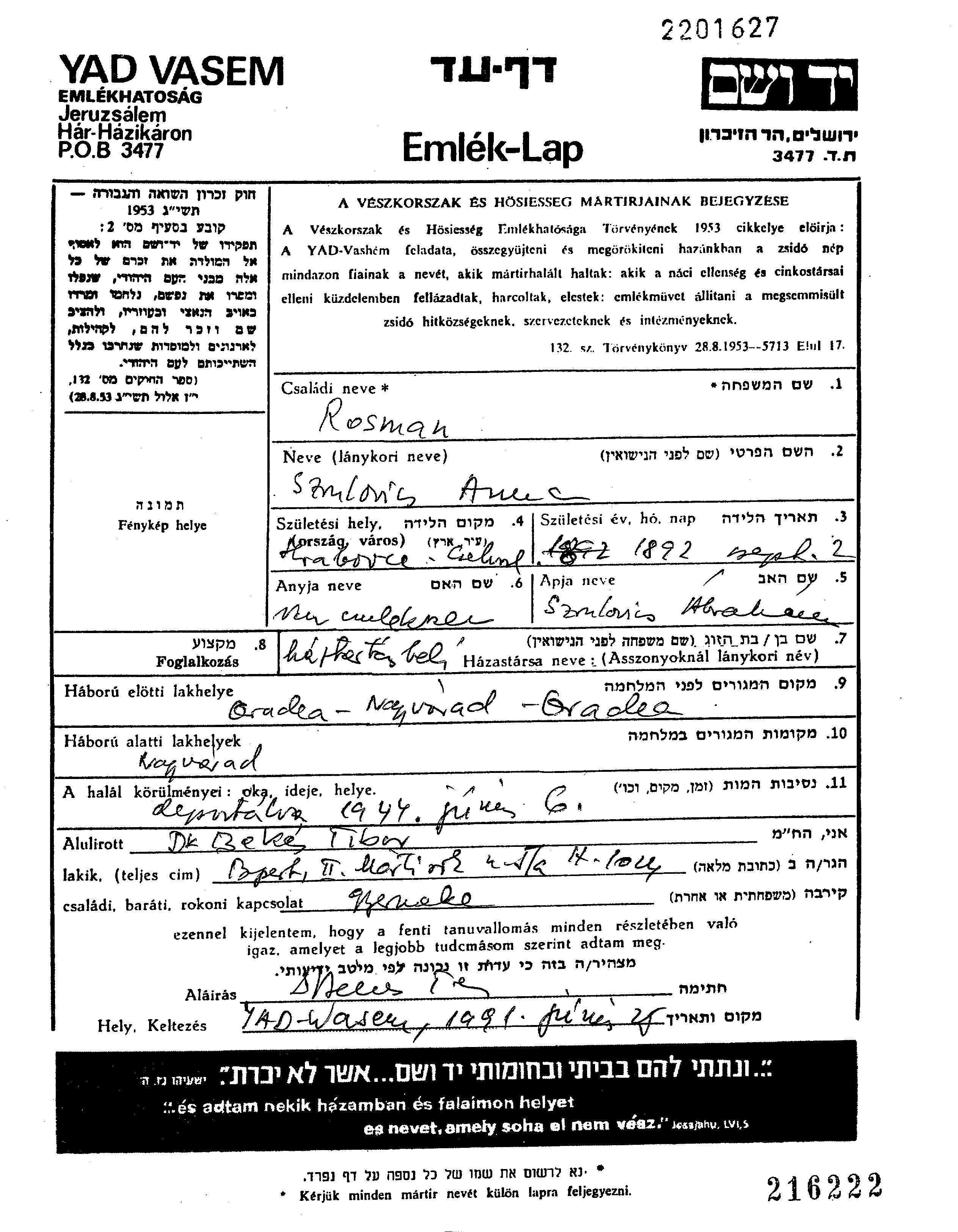 Rosman Anna 1892 Nagyvarad, Romania Page of Testimony