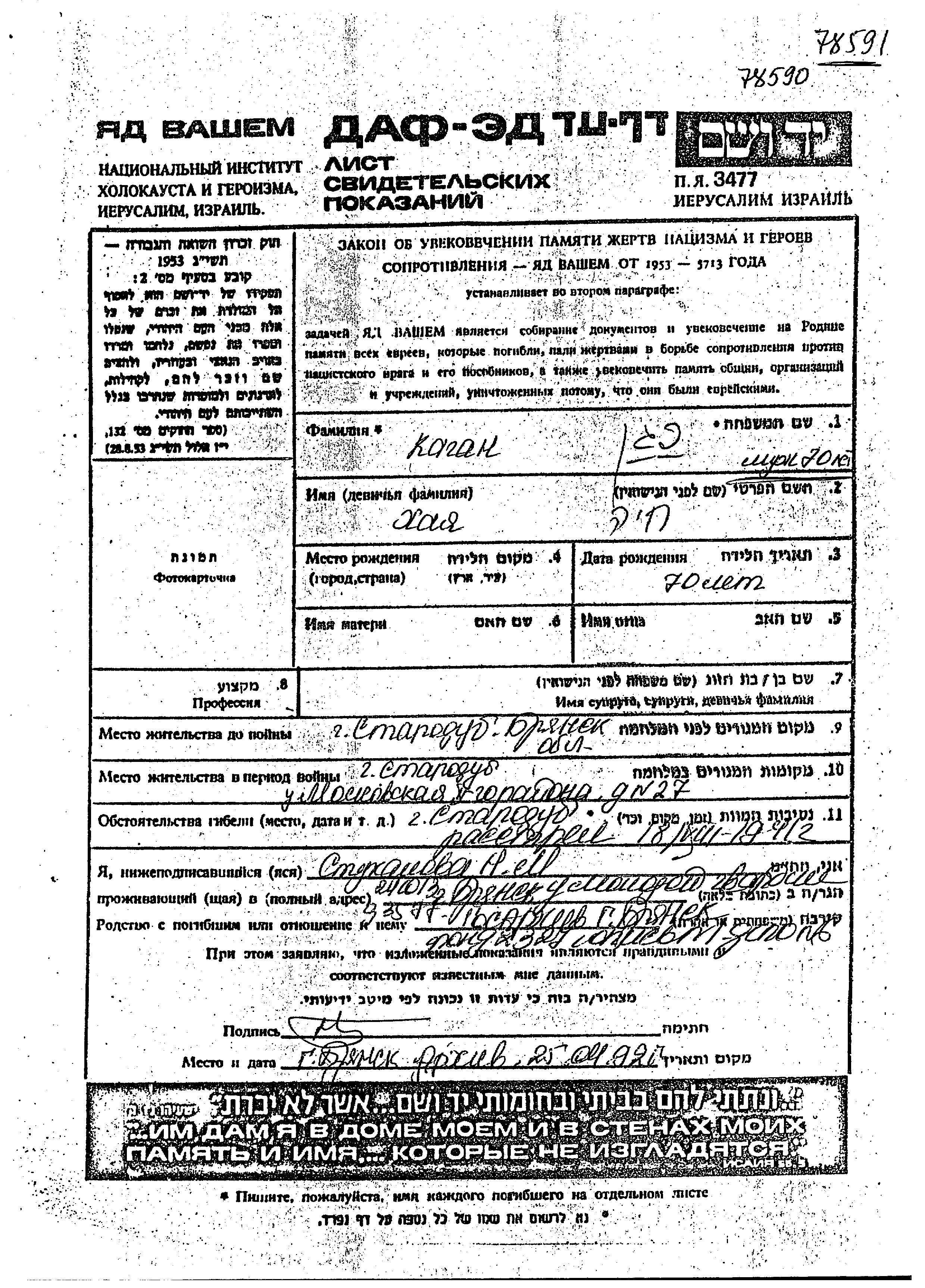 First name unknown Kagan was born, 1871. He was married. Prior to WWII he lived in Starodub, Russia (USSR). During the war he was in Starodub, Russia (USSR). He was murdered in the Shoah. Place of death: Starodub, Russia (USSR), 18/08/1941.