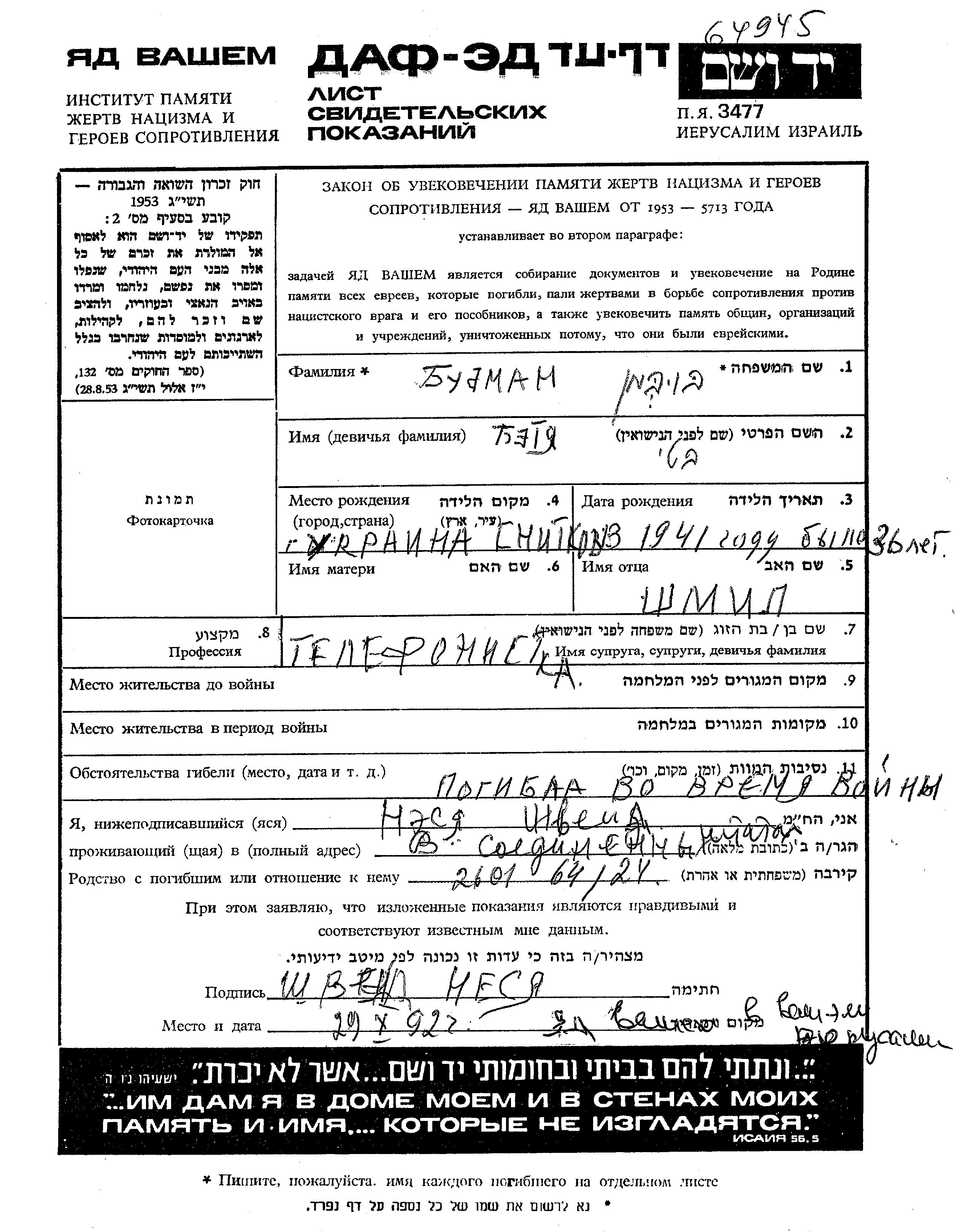 Betia Bubman Bobman was born in Snitkov, Ukraine (USSR) to Shmil. She was a switchboard operator. Prior to WWII she lived in Snitkov, Ukraine (USSR). During the war she was in Snitkov, Ukraine (USSR). Betia was murdered in the Shoah.