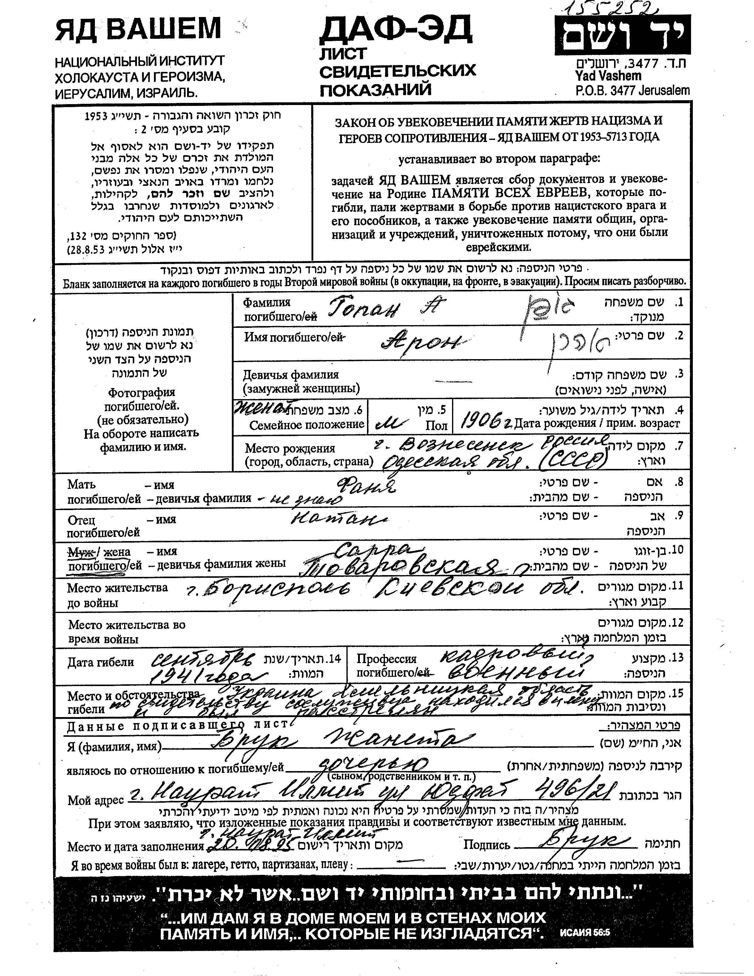 Gopan Aron 1906 Borispol, Ukraine (USSR) Page of Testimony