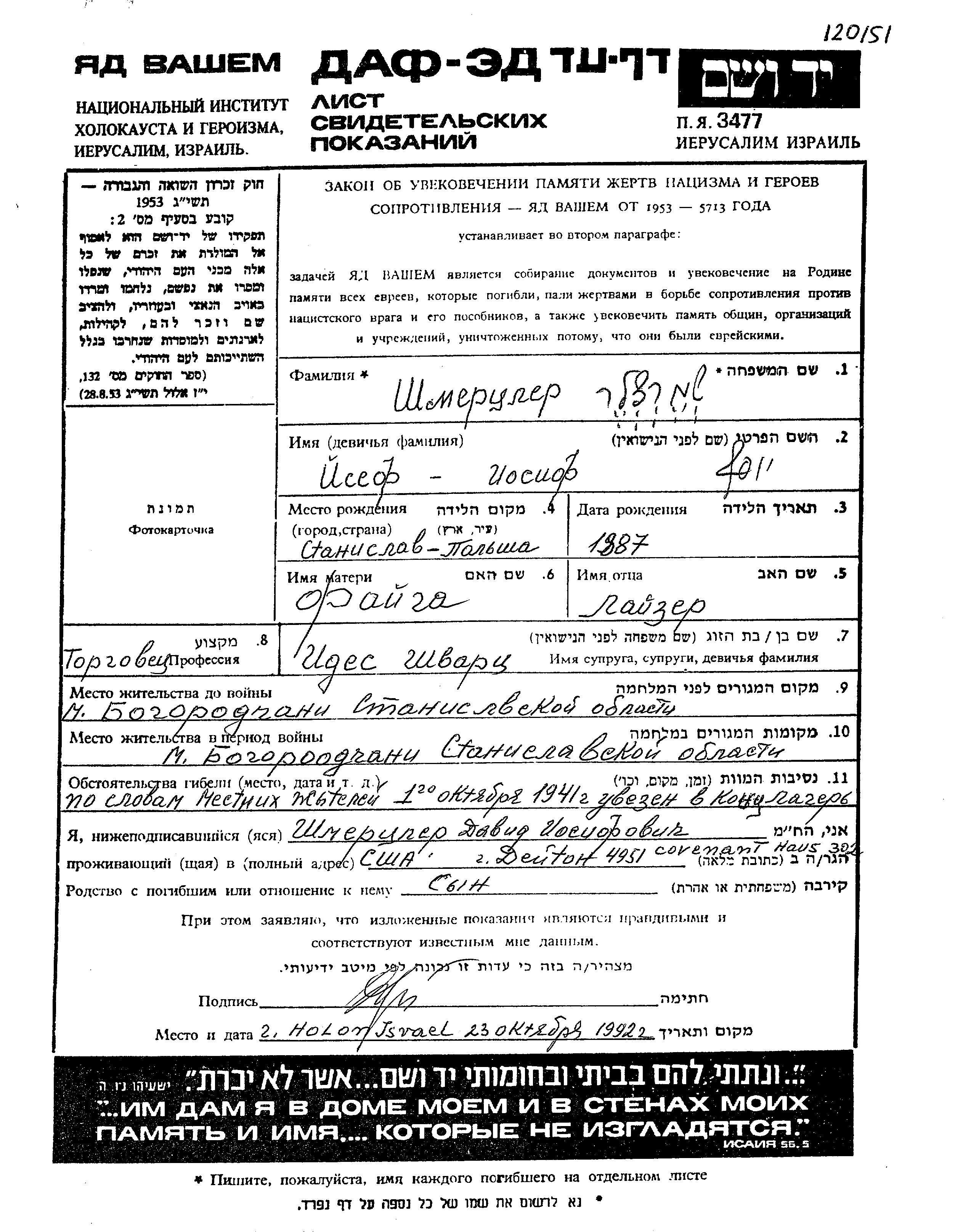 Shmertzler Iosif 1887 Bohorodczany, Poland Page of Testimony