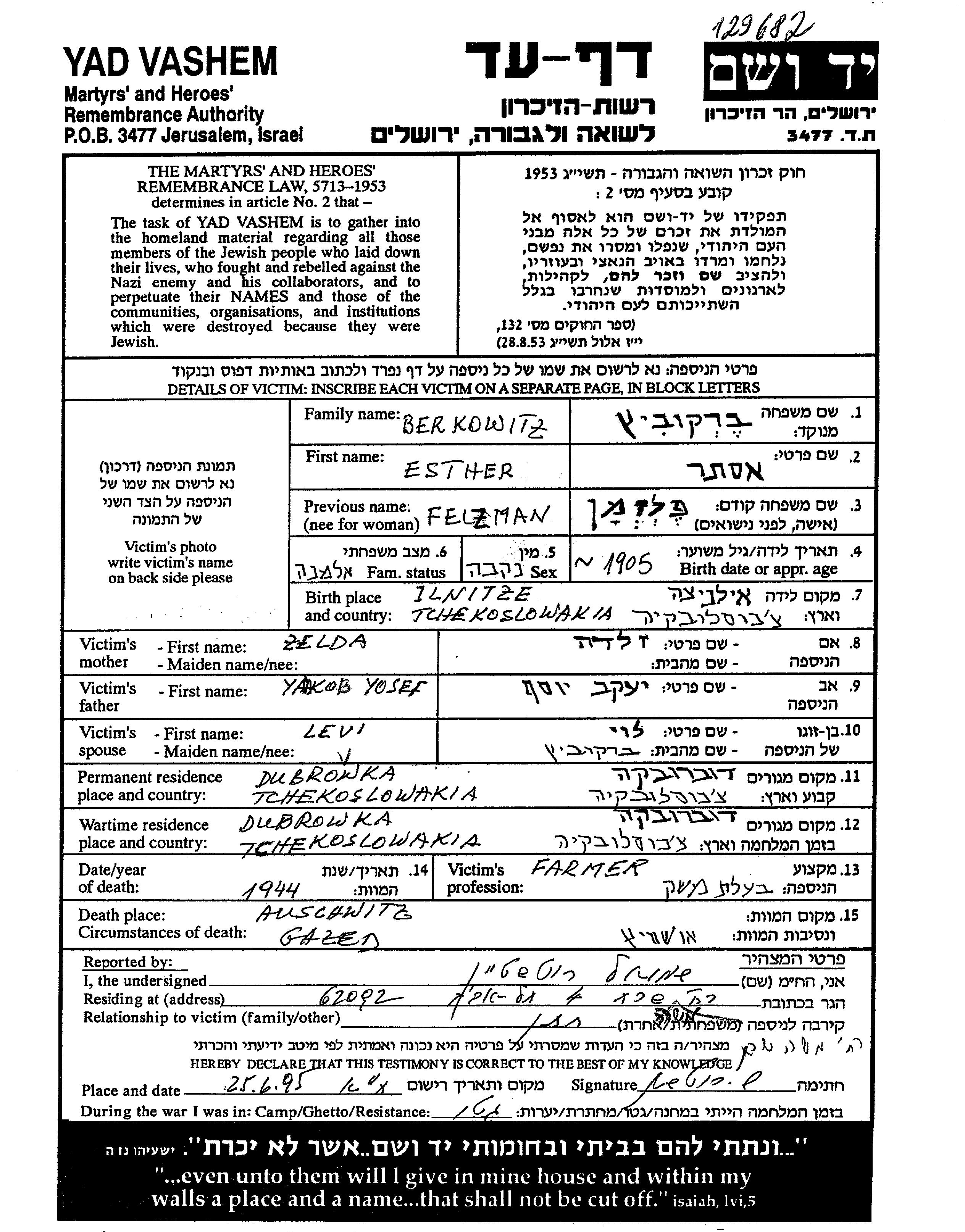 Berkowitz Esther 1905 Dubrovka, Czechoslovakia Page of Testimony
