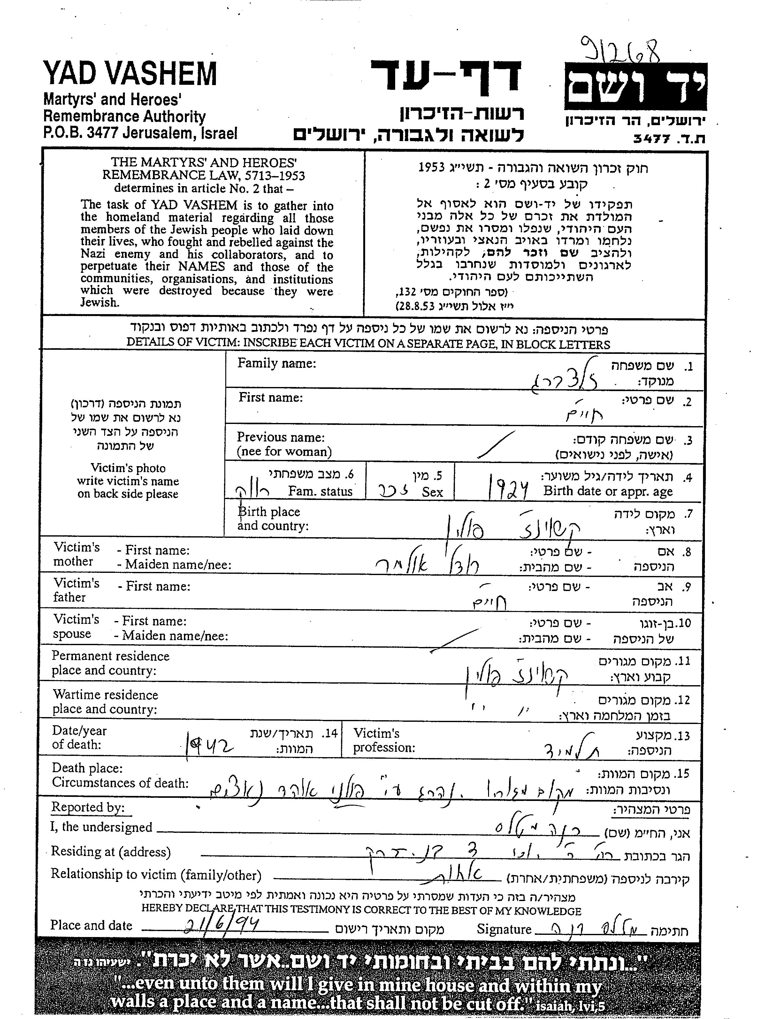 Chaim Zaltzberg was born in Ksiaz Wielki, Poland, 1924 to Chaim and Rudel Roza nee Ulmer. He was a pupil and single. Prior to WWII he lived in Ksiaz Wielki, Poland. During the war he was in Ksiaz Wielki, Poland. Chaim was murdered in the Shoah. Place of death: Ksiaz Wielki, Poland, 1942.
