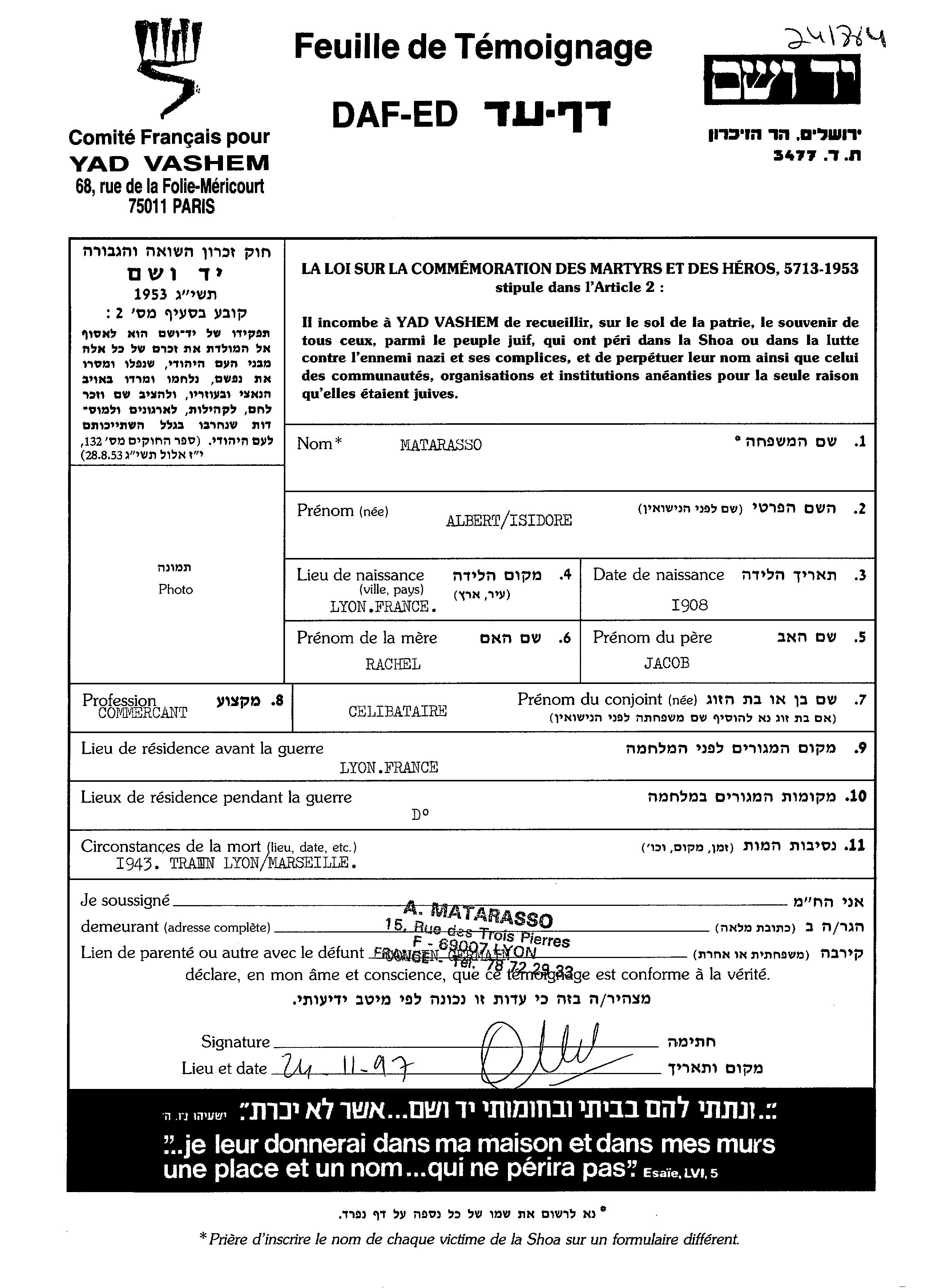 Matarasso Isidore Albert 1908 Lyon, France Page of Testimony