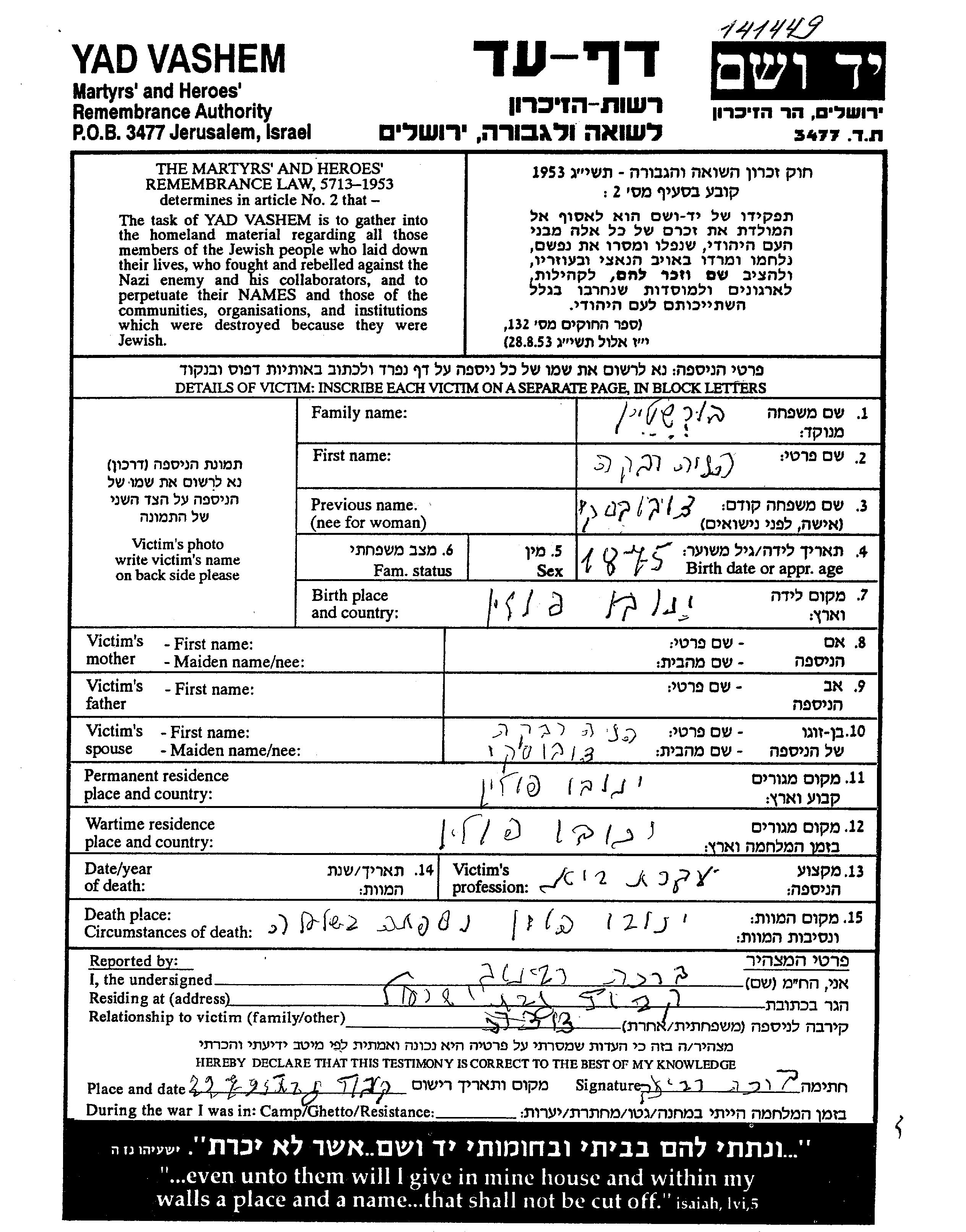 Henia Rivka Burshtein nee Dubovski was born in Janowo, Poland, 1875. She was a housewife. Prior to WWII she lived in Janowo, Poland. During the war she was in Janowo, Poland. Henia Rivka was murdered in the Shoah. Place of death: Janowo, Poland.