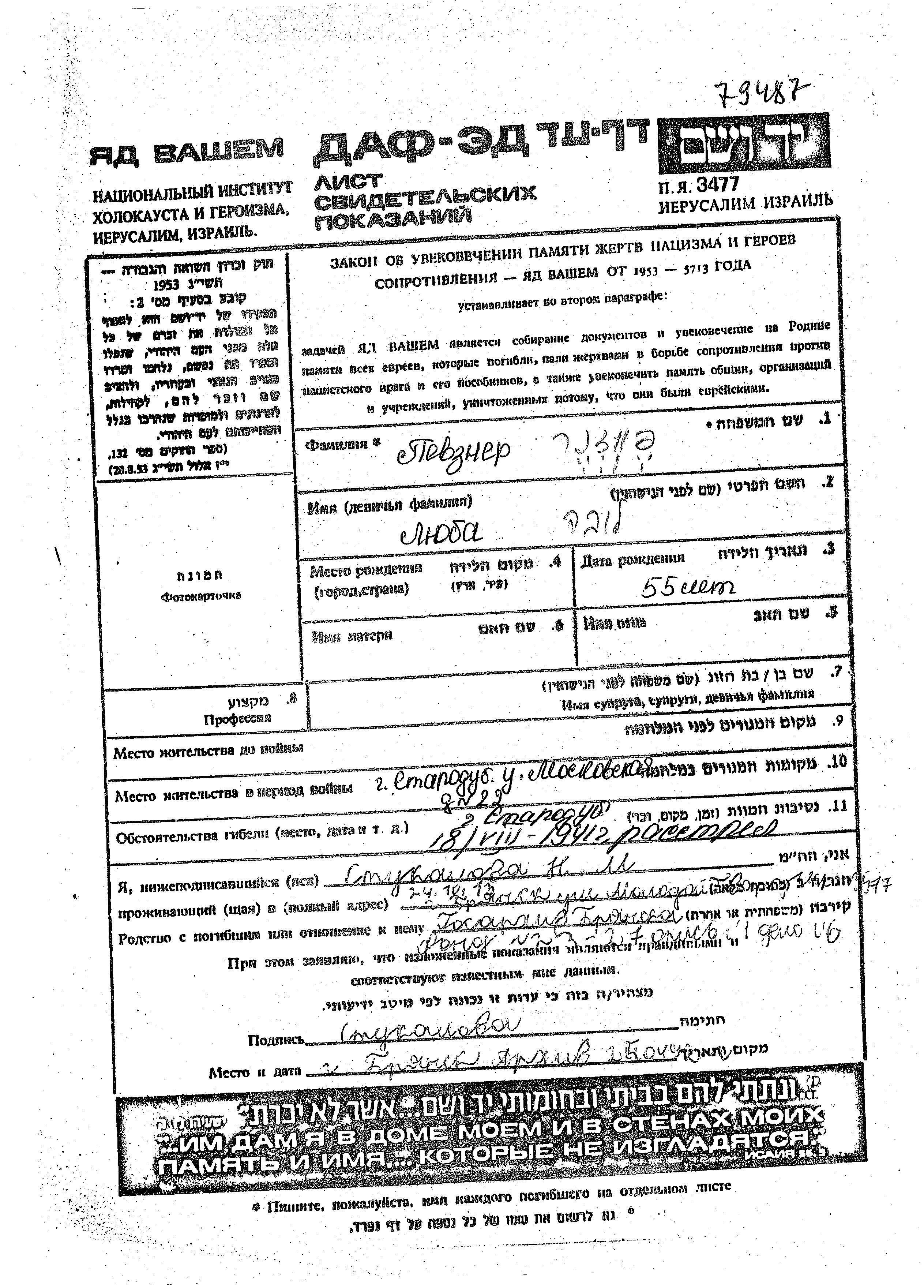 Lyuba Pevzner was born, 1886. Prior to WWII she lived in Starodub, Russia (USSR). During the war she was in Starodub, Russia (USSR).