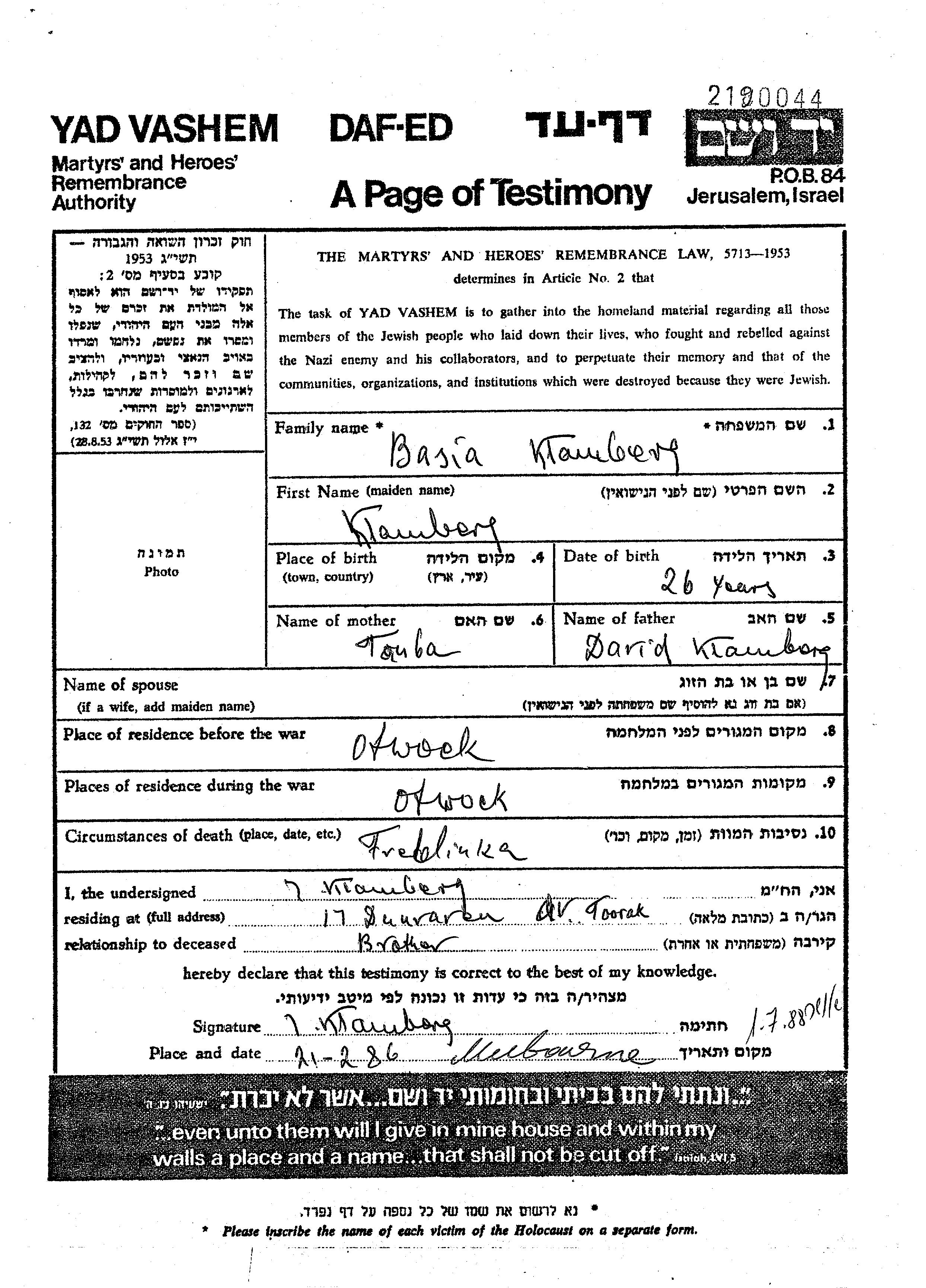 Klamberg Basia Otwock, Poland Page of Testimony