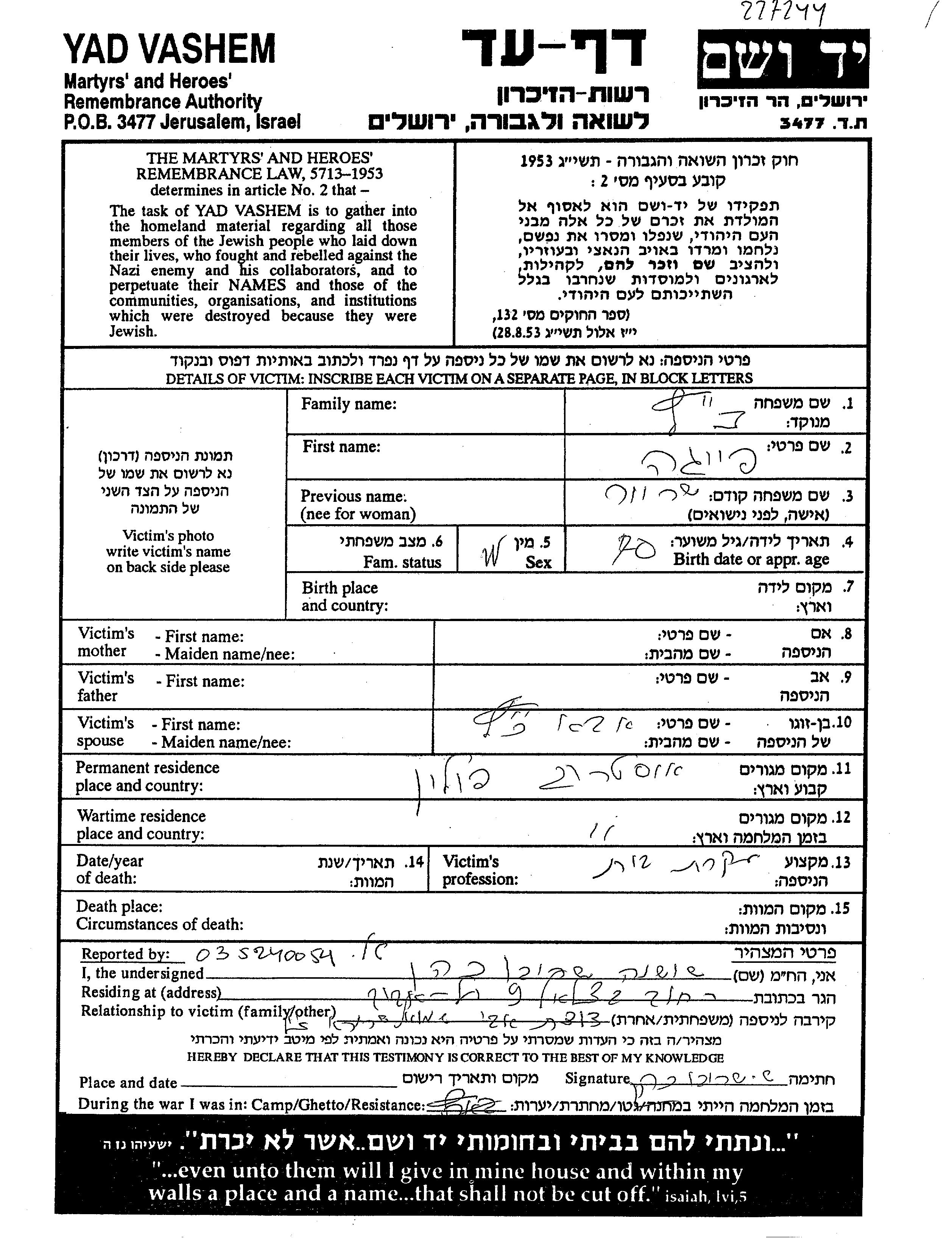 Feiga Kaz Katz nee Shrayer was born in Ukraine (USSR). She was a housewife and married to Aba. Prior to WWII she lived in Ostrog, Poland. During the war she was in Ostrog, Poland. Feiga was murdered in the Shoah.