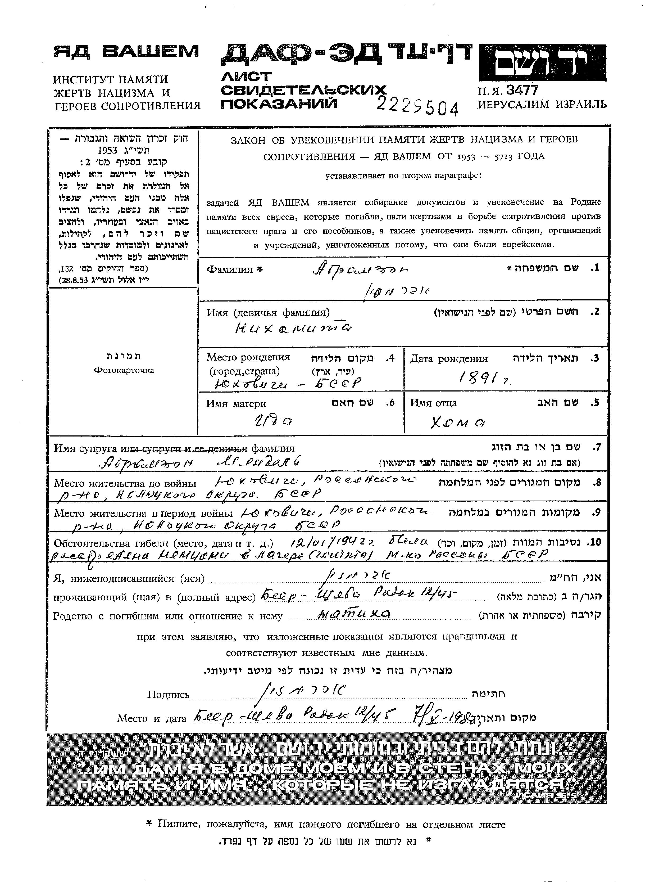 Nikhameta Abramzon was born in Yukhovichi, Belorussia (USSR), 1891 to Khema and Ita. She was married to Mendel. Prior to WWII she lived in Yukhovichi, Belorussia (USSR). During the war she was in Yukhovichi, Belorussia (USSR). Nikhameta was murdered in the Shoah. Place of death: Rossony, Belorussia (USSR), 12/01/1942.